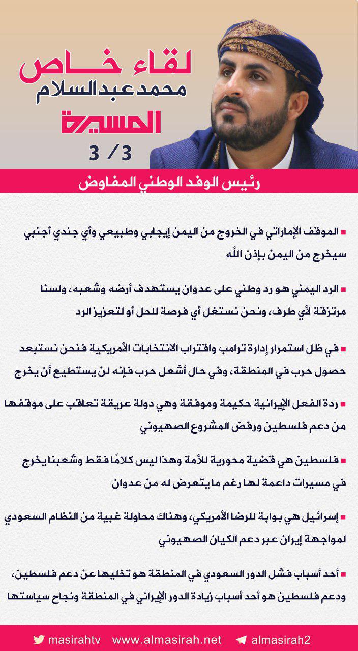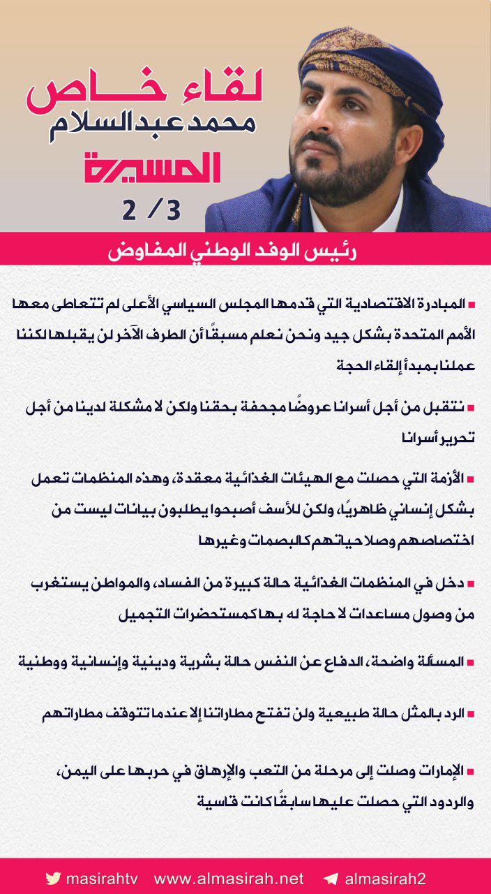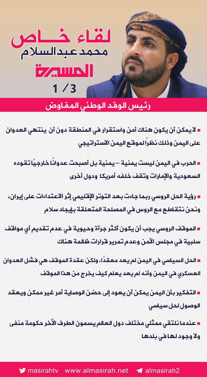 فيما يلي ملخص مقابلة رئيس الوفد الوطني المفاوض محمد عبدالسلام مع قناة المسيرة: