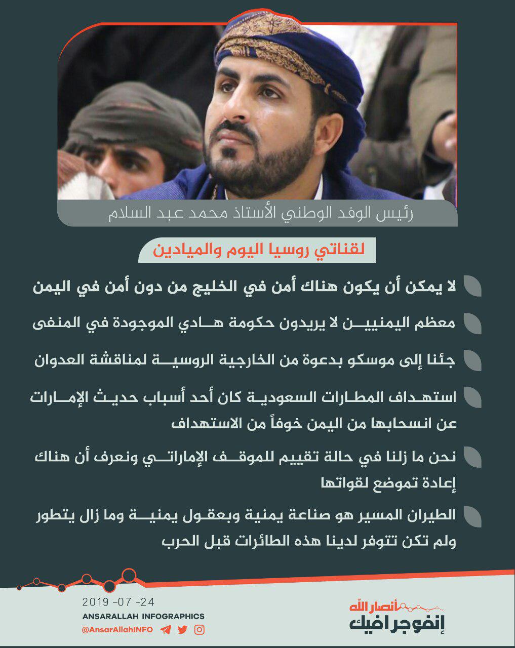 وأكد عبدالسلام أن لليمنيين الحق بالرد والاستهداف لكل المنشئات الحيوية والعسكرية والاقتصادية بعيدا عن الاهداف المدنية باعتبار ذلك حق مشروعا وطبيعيا لليمنيين، مشيرا أنه إذا لم يتوقف العدوان لاخيار لليمنيين سوى مواجهة العدوان، وكذلك على الإمارات الانسحاب جدياً حتى لانقوم بالرد عليها.