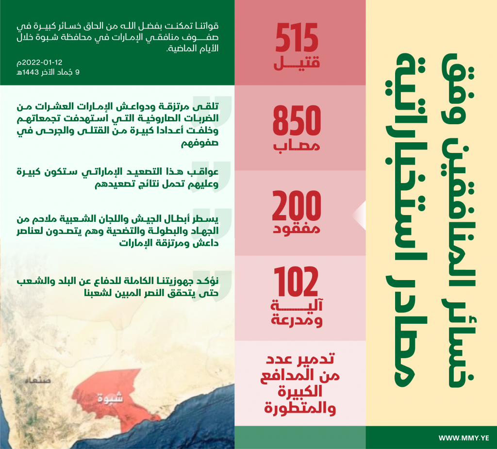 وأوضح العميد سريع في بيان صادر عنه اليوم، أن قوات الجيش واللجان الشعبية تمكنت بفضل الله من إلحاق خسائر كبيرة جدا في صفوف مرتزقة ودواعش الإمارات في شبوة خلال الأيام الماضية حيث بلغ عدد القتلى أكثر من 515 قتيل بينهم قادة، وعدد الجرحى تجاوز 850 جريحا، وأكثر من 200 مفقود بحسب مصادر استخباراتية.