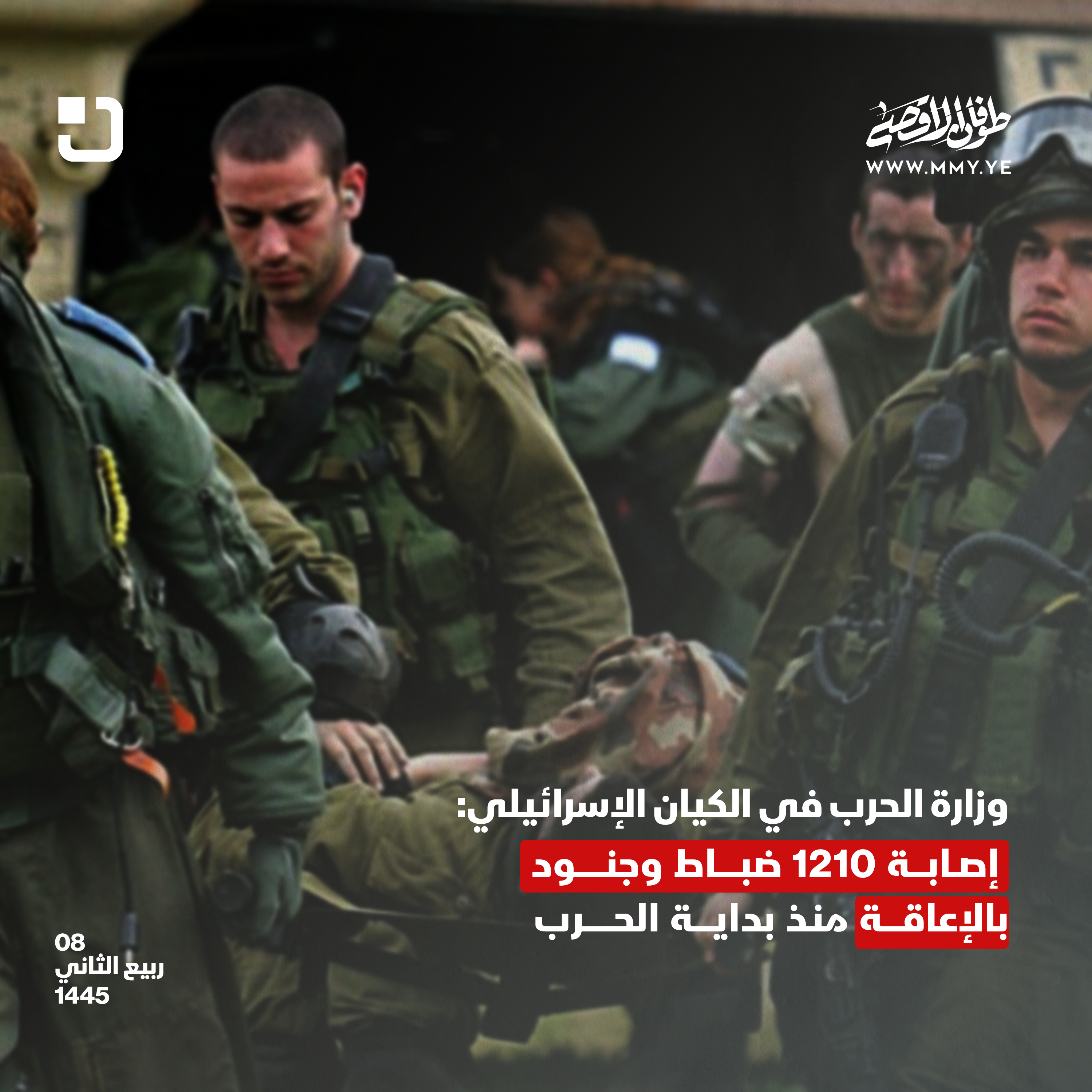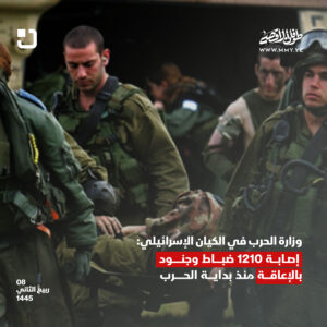 9:37 ص | إعلام العدو: 1400 قتيل إسرائيلي و5400 جريح وأكثر من 212 أسير منذ بدء طوفان الأقصى