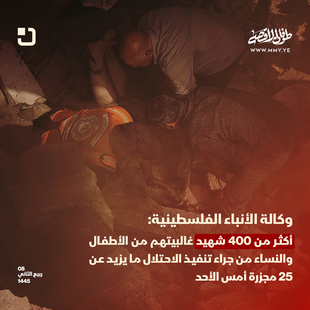 3:54 ص | وكالة الأنباء الفلسطينية: أكثر من 400 شهيد غالبيتهم من الأطفال والنساء جراء تنفيذ العدو الصهيوني ما يزيد عن 25 مجزرة أمس الأحد