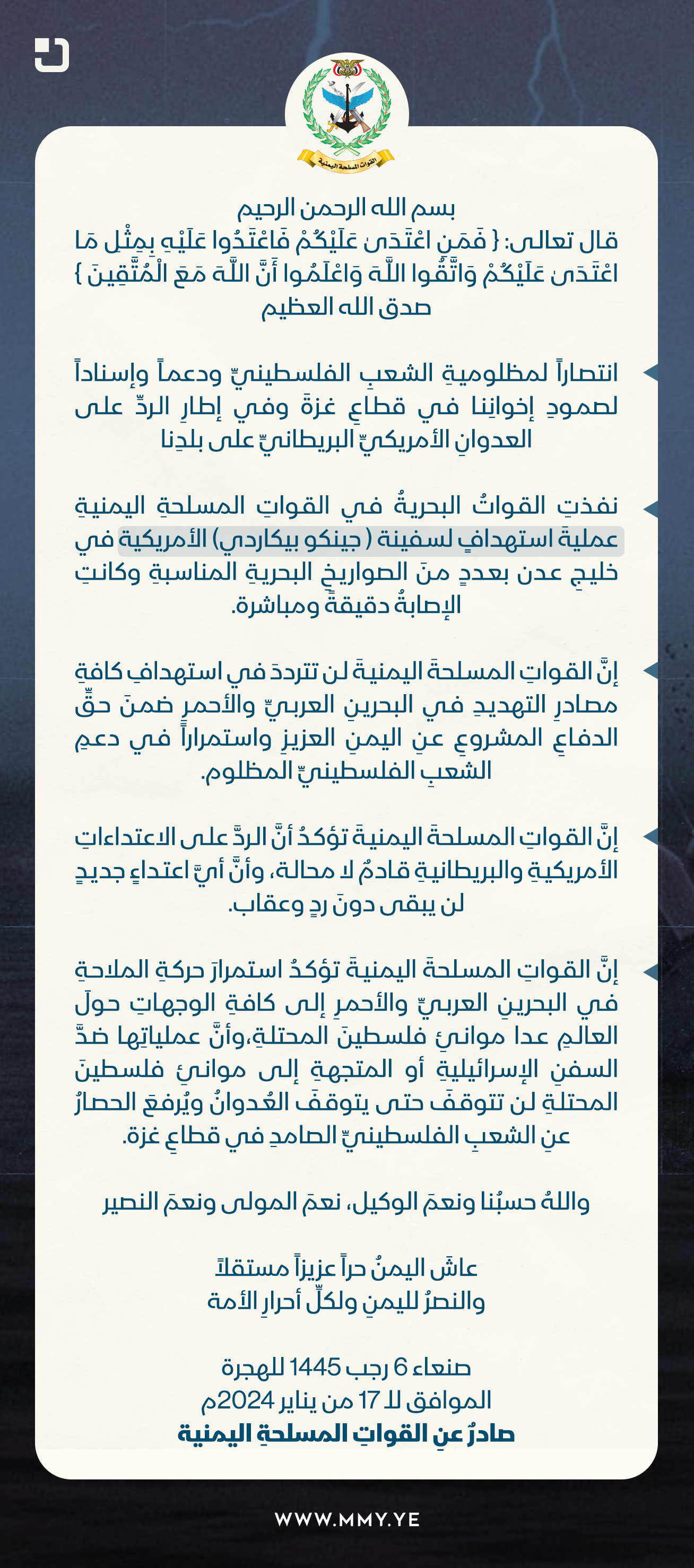 بيان القوات المسلحة اليمنية بشأن استهداف سفينة “جينكو بيكاردي” الأمريكية في خليج عدن – 17-01-2024م