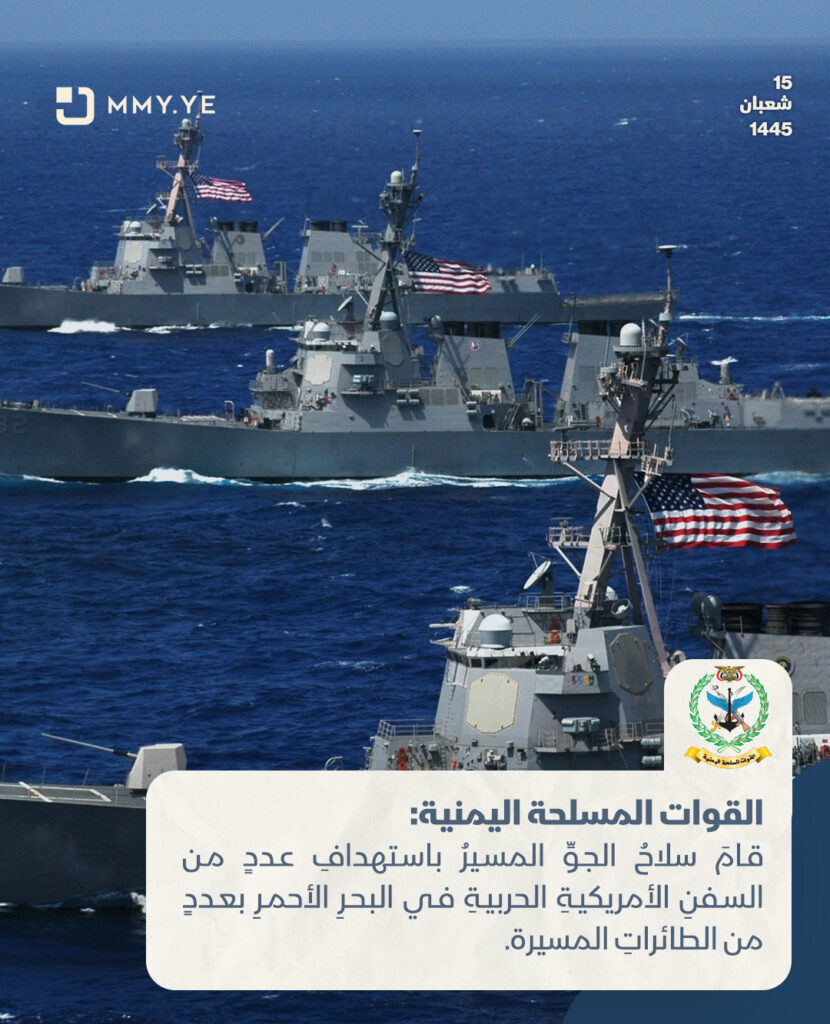 فيما قامَ سلاحُ الجوِّ المسيرُ باستهدافِ عددٍ من السفنِ الأمريكيةِ الحربيةِ في البحرِ الأحمرِ بعددٍ من الطائراتِ المسيرة.