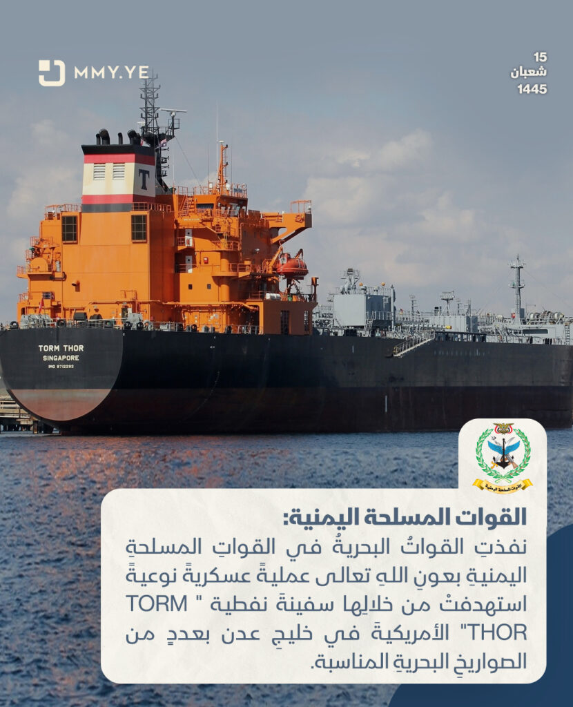 نفذتِ القواتُ البحريةُ في القواتِ المسلحةِ اليمنيةِ بعونِ اللهِ تعالى عمليةً عسكريةً نوعيةً استهدفتْ من خلالِها سفينةَ نفطية ” TORM THOR” الأمريكيةَ في خليجِ عدن بعددٍ من الصواريخِ البحريةِ المناسبة.
