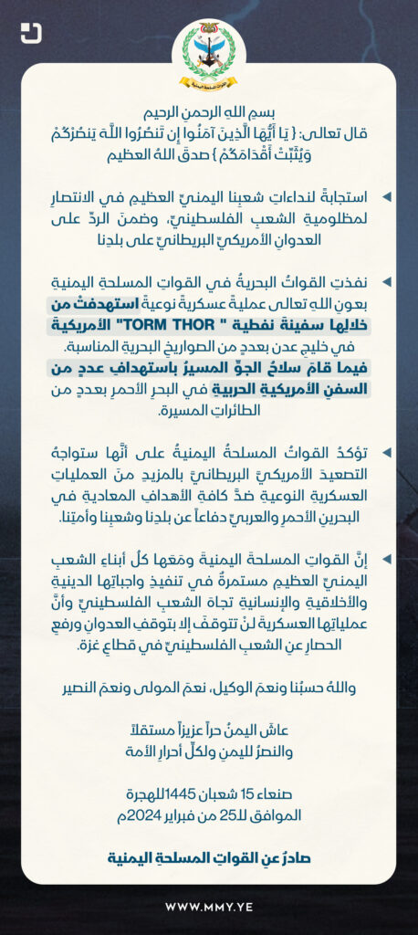 بيان القوات المسلحة اليمنية بشأن استهداف سفينة النفط الأمريكية “TORM THOR” بصواريخ بحرية في خليج عدن واستهداف عدد من السفن الأمريكية الحربية في البحر الأحمر بعدد من الطائرات المسيرة 25-2-2024م