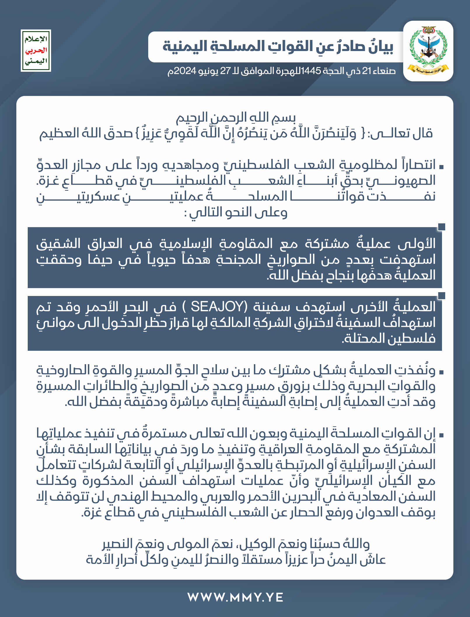 بيان القوات المسلحة اليمنية بشأن تنفيذ عمليتين عسكريتين أولاهما بالاشتراك مع المقاومة الإسلامية العراقية استهدفت هدفا حيويا في ميناء حيفا والأخرى استهدفت سفينة (SEAJOY) في البحر الأحمر
