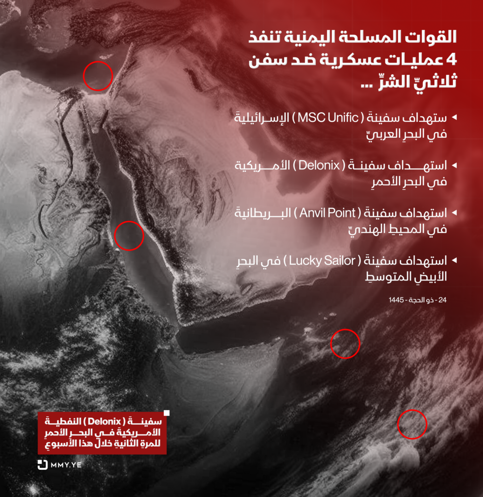 نفذتِ القواتُ المسلحةُ اليمنيةُ بعونِ اللهِ تعالى أربعَ عملياتٍ عسكريةٍ نوعيةٍ استهدفتْ أربعَ سُفُنٍ تابعةٍ لثلاثيِّ الشرِّ الأمريكيِّ والبريطانيِّ و الإسرائيليِّ وكانتْ على النحو التالي:
