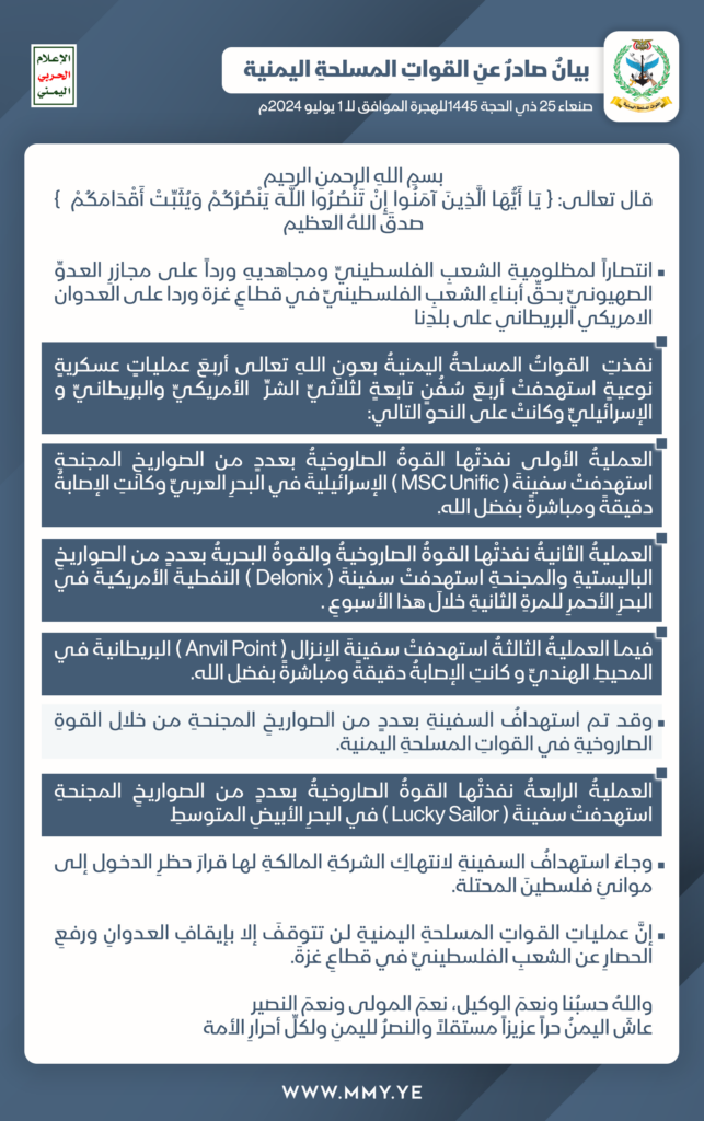 بيان القوات المسلحة اليمنية بشأن تنفيذ أربع عمليات عسكرية استهدفت أربع سفن تابعة لثلاثي الشر أمريكا وبريطانيا والعدو الصهيوني بتاريخ 01-07-2024م