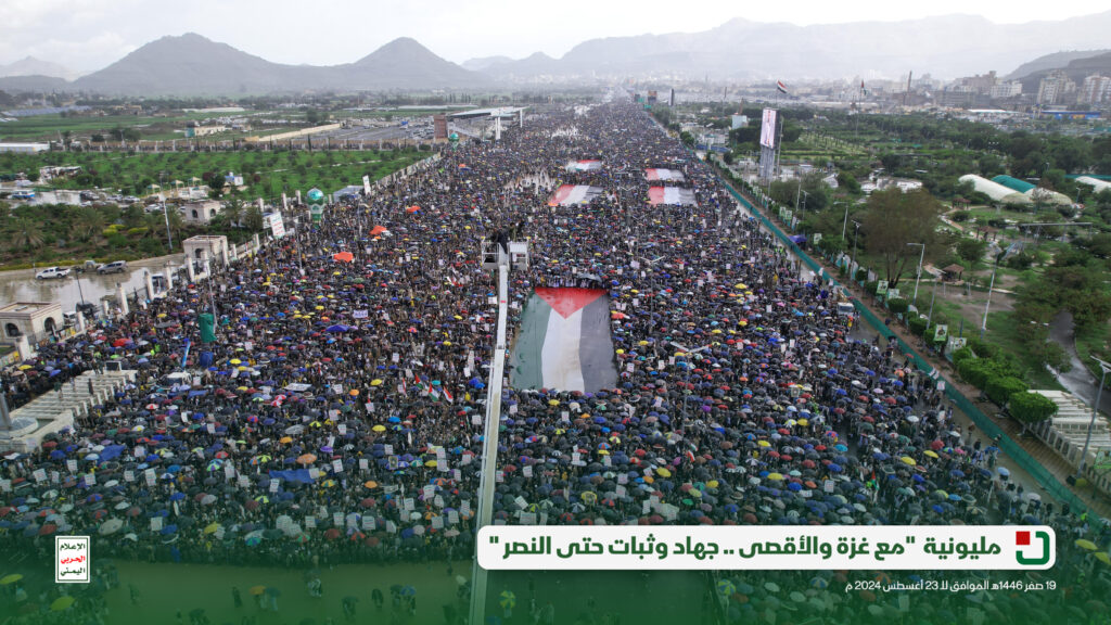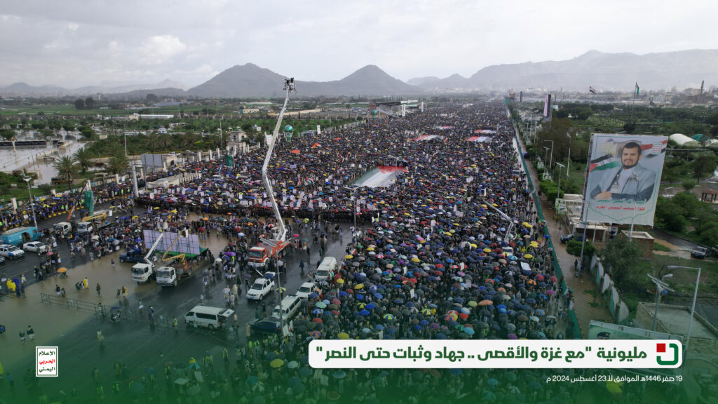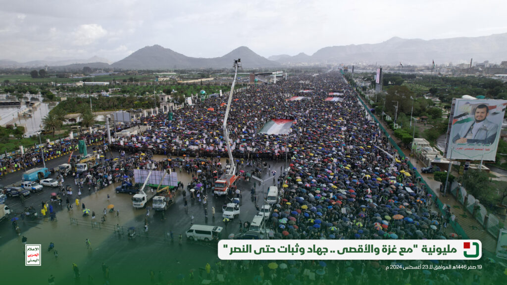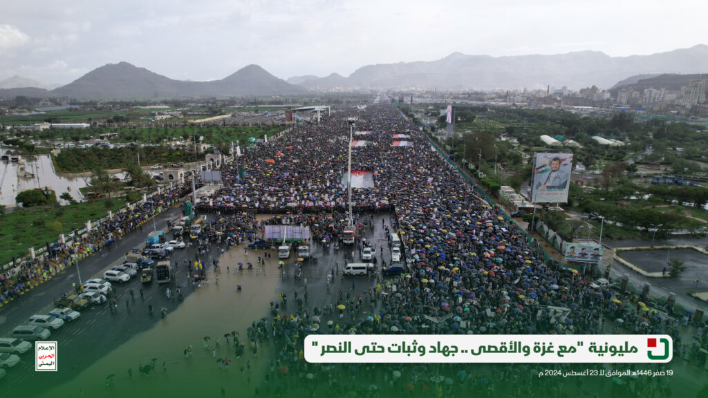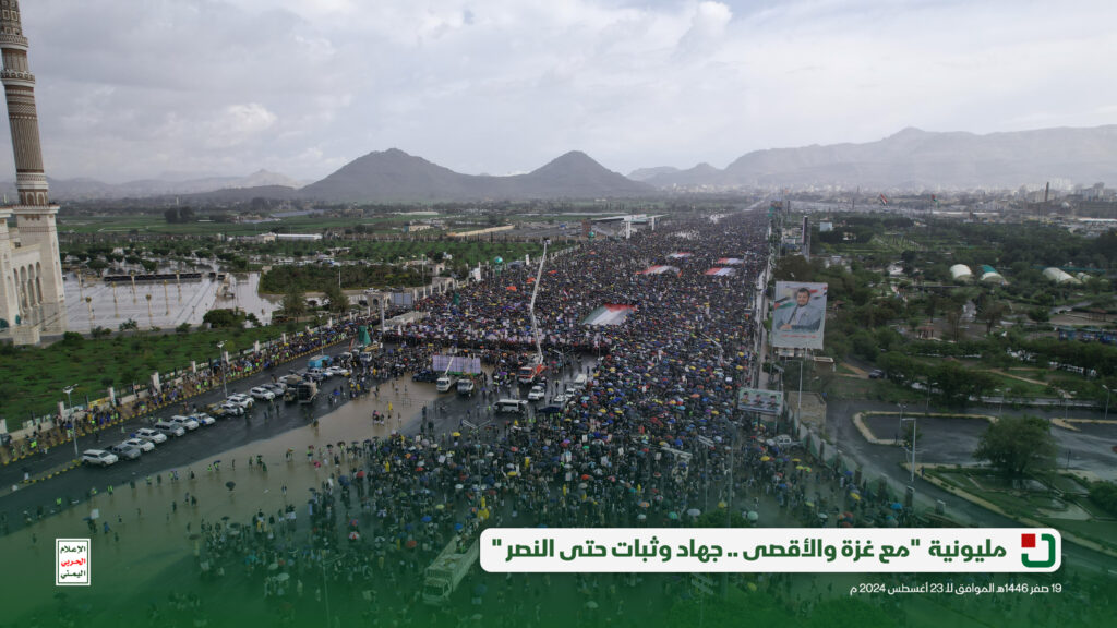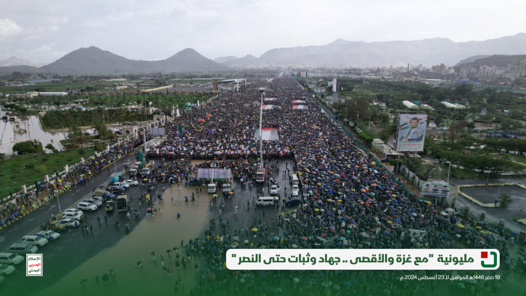 وعلى الرغم من الأجواء الماطرة بغزارة إلا أن أكبر ميادين العاصمة امتلأ كما في الأسابيع السابقة بحشود مليونية جاءت ملبية لدعوة السيد القائد عبدالملك بدرالدين الحوثي مؤكدة مواصلة نصرة وإسناد غزة، حاملة الأعلام اليمنية والفلسطينية، ورايات الحرية واللافتات الداعية إلى مقاطعة المنتجات الأمريكية والإسرائيلية.