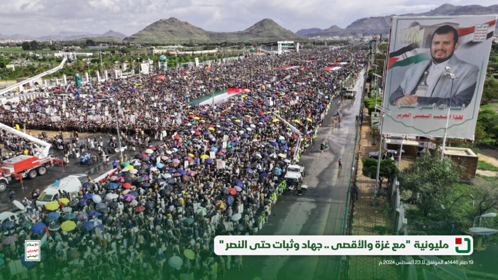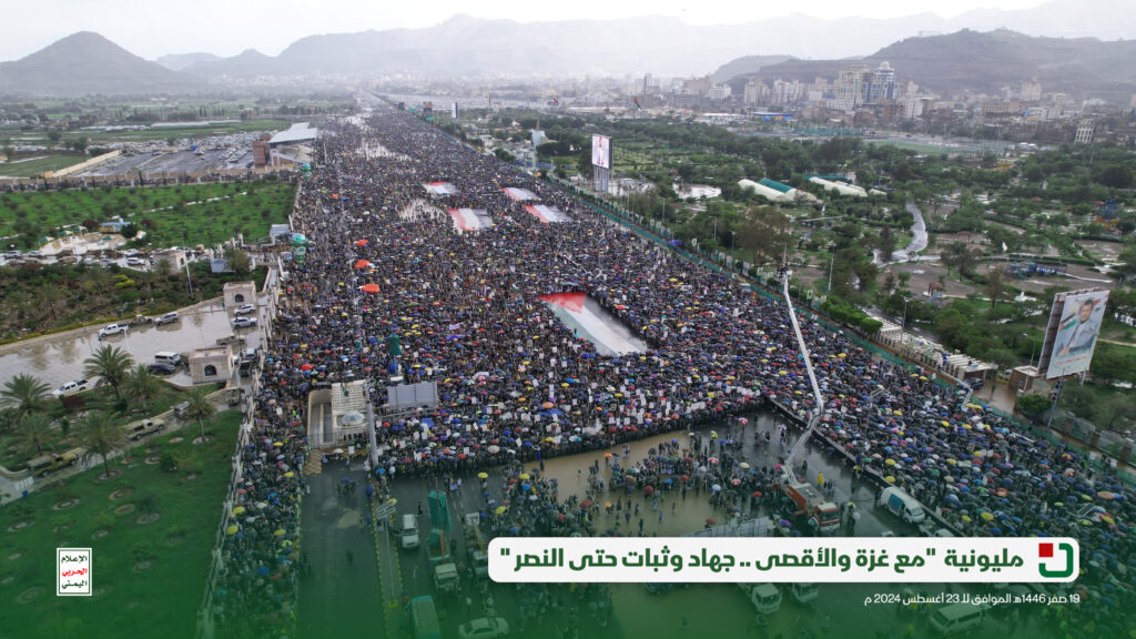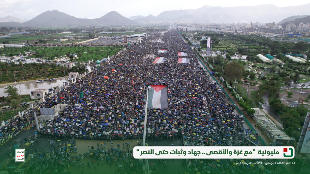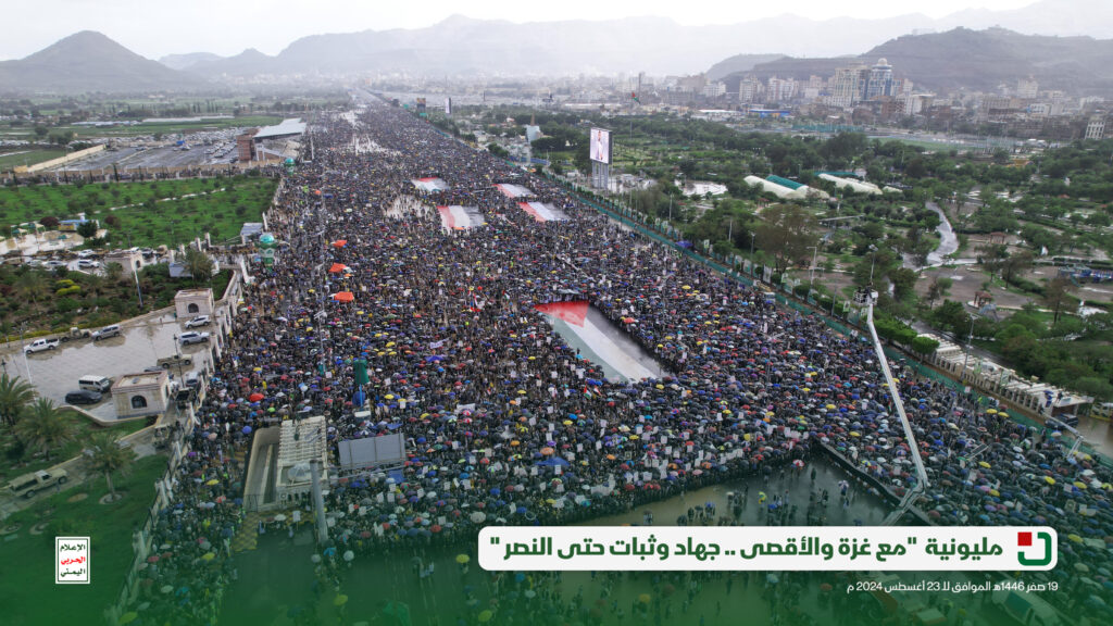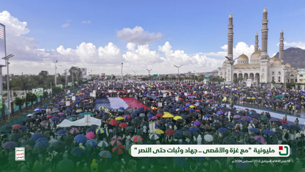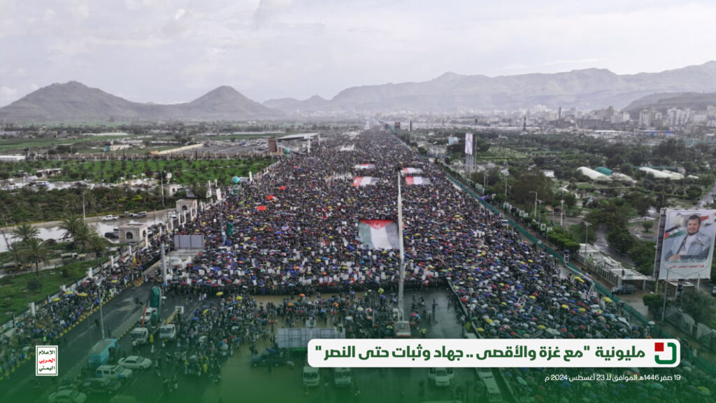 وعلى الرغم من الأجواء الماطرة بغزارة إلا أن أكبر ميادين العاصمة امتلأ كما في الأسابيع السابقة بحشود مليونية جاءت ملبية لدعوة السيد القائد عبدالملك بدرالدين الحوثي مؤكدة مواصلة نصرة وإسناد غزة، حاملة الأعلام اليمنية والفلسطينية، ورايات الحرية واللافتات الداعية إلى مقاطعة المنتجات الأمريكية والإسرائيلية.