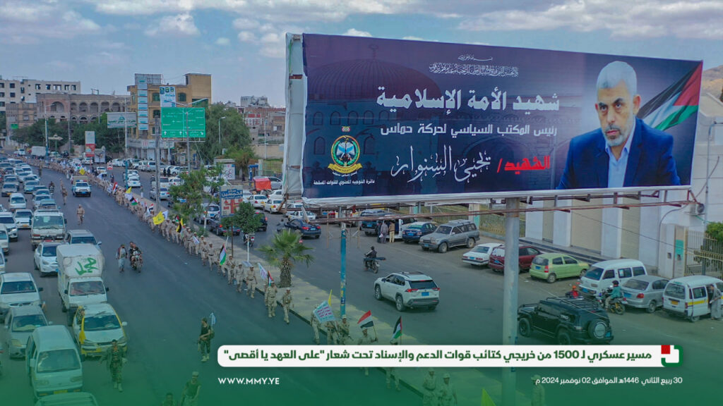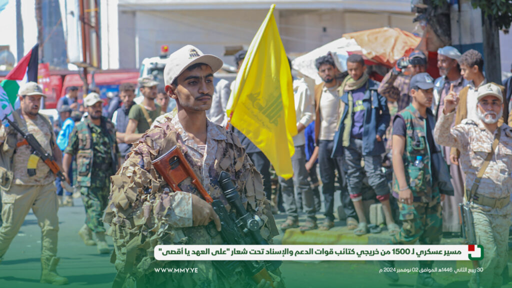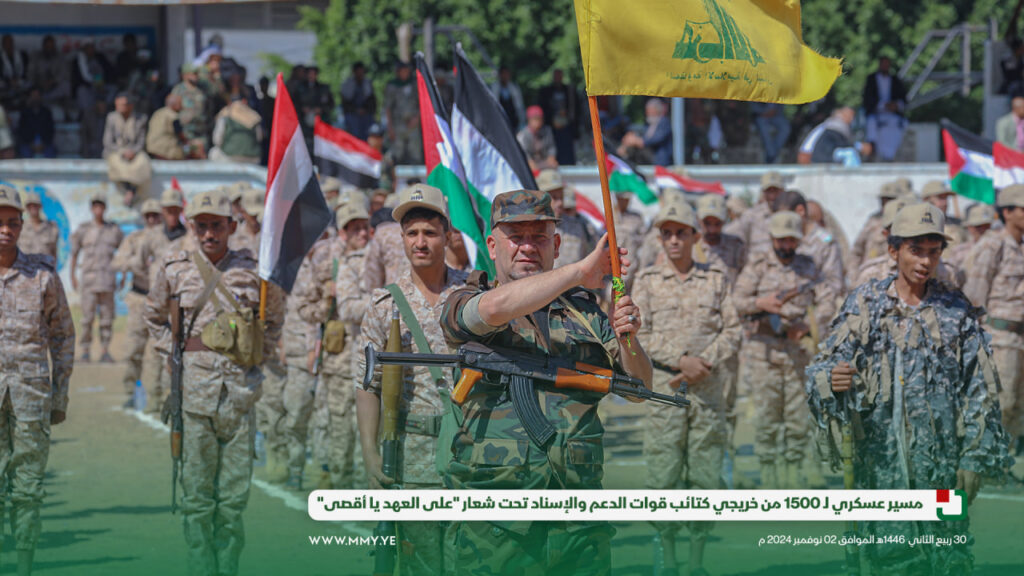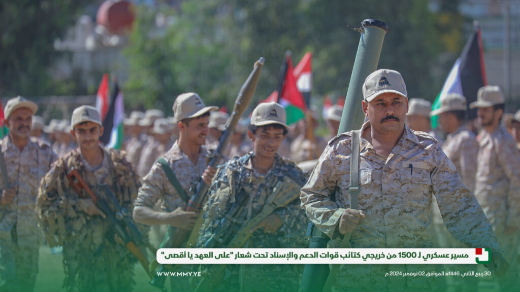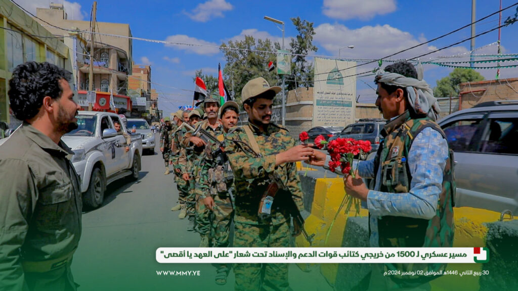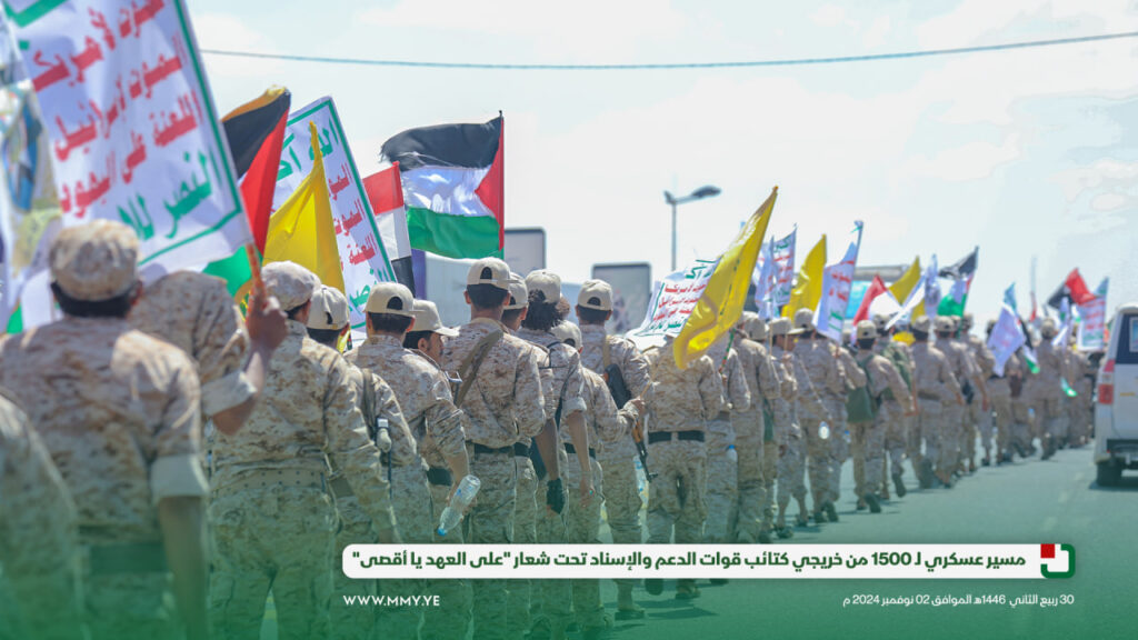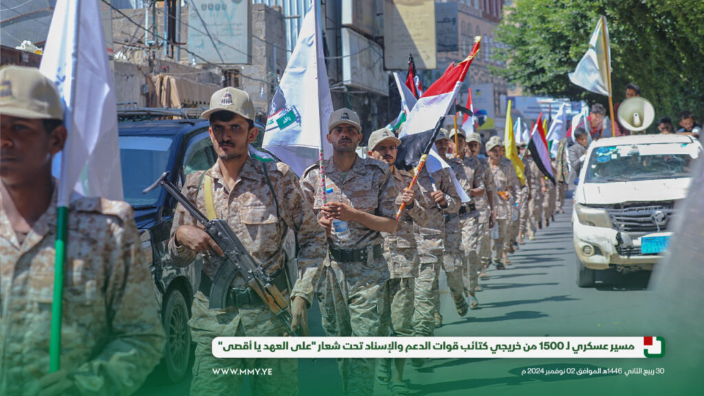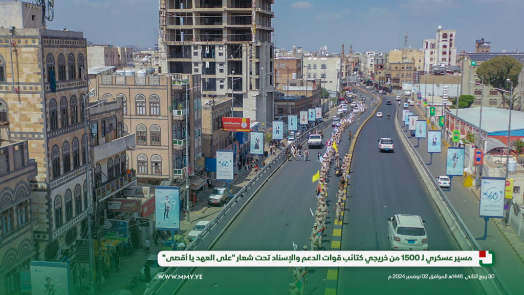 شهدت العاصمة صنعاء مسيرًا عسكريًا كبيراً تحت شعار “على العهد يا أقصى”، وذلك بمناسبة تخرج وحدة رمزية من دورة “أمر فريق” من كتائب قوات الدعم والإسناد، بمشاركة 1500 مقاتل.