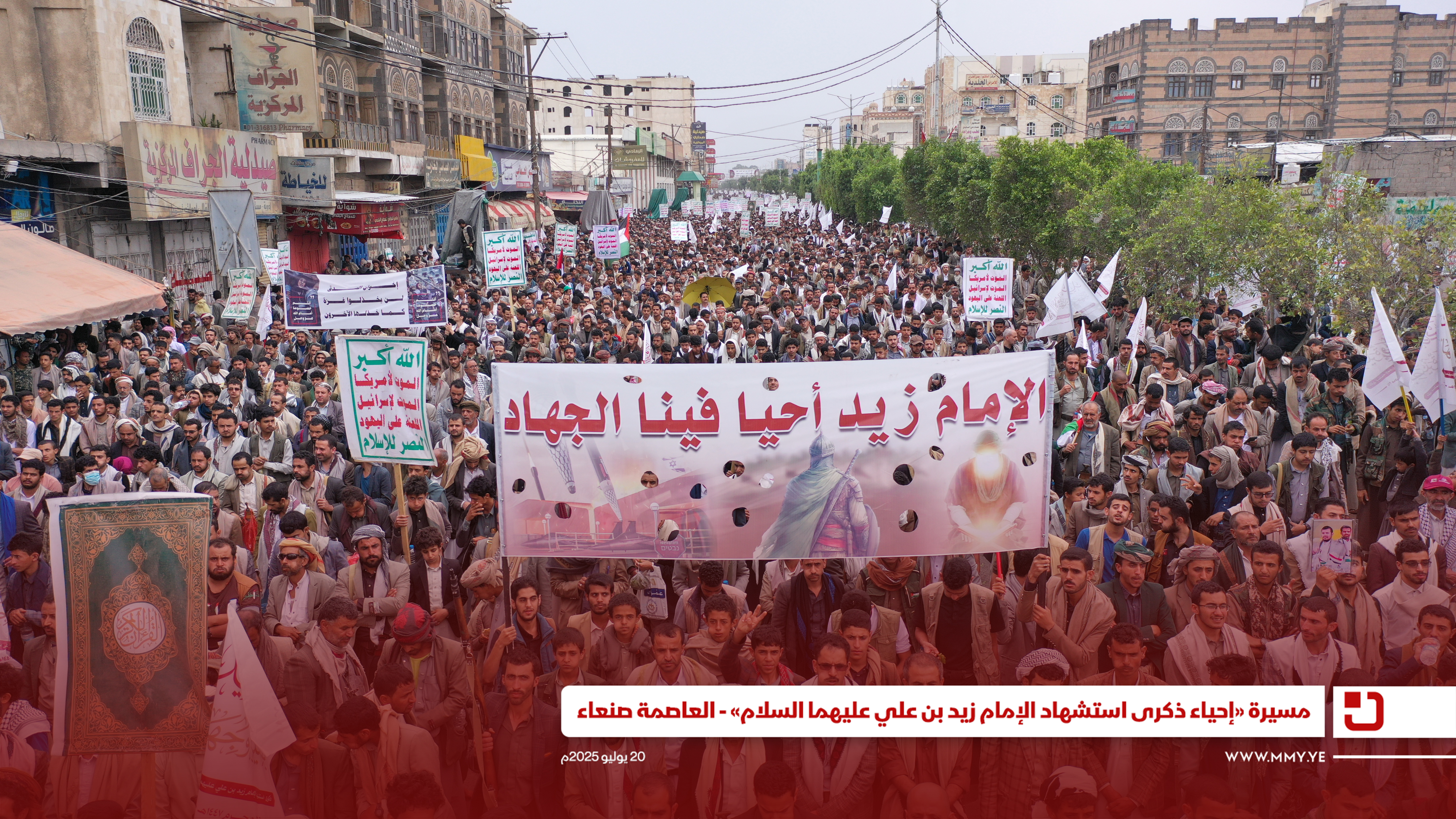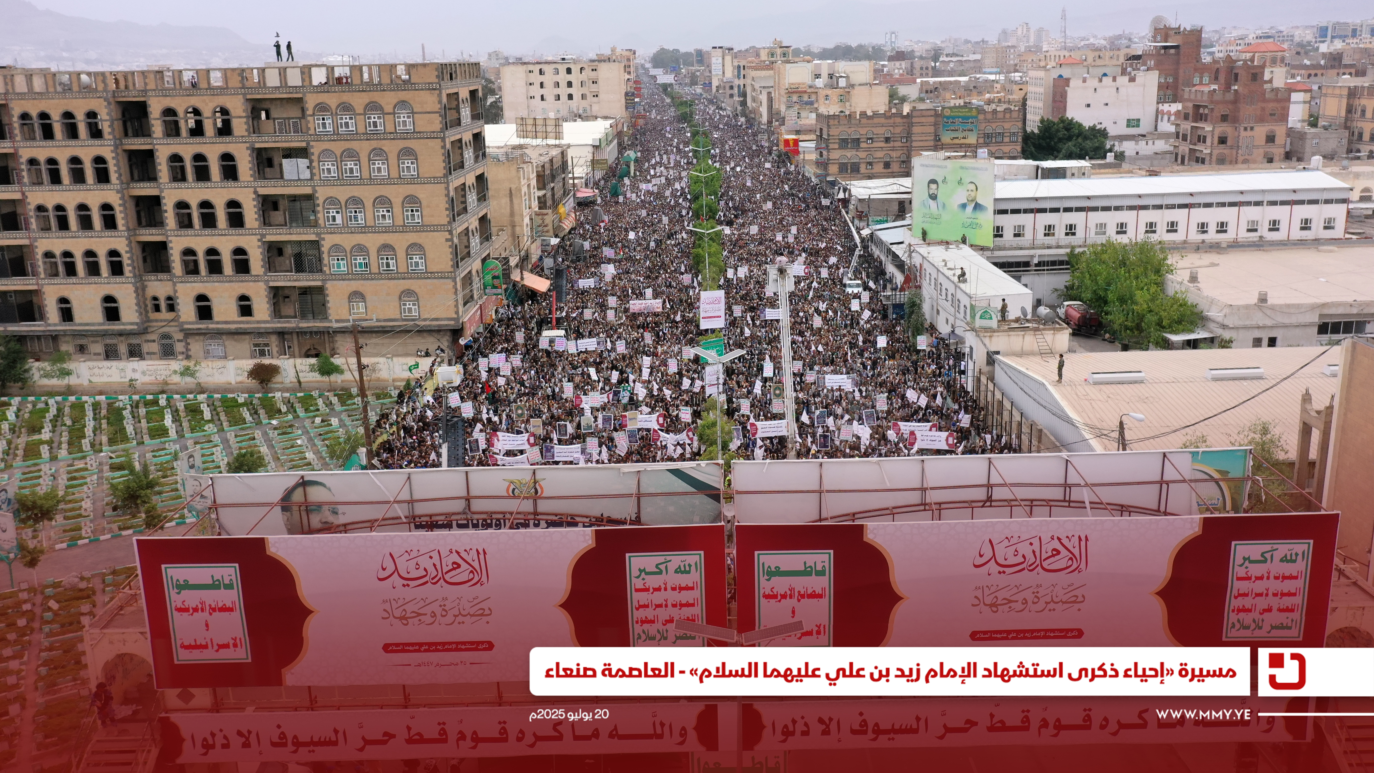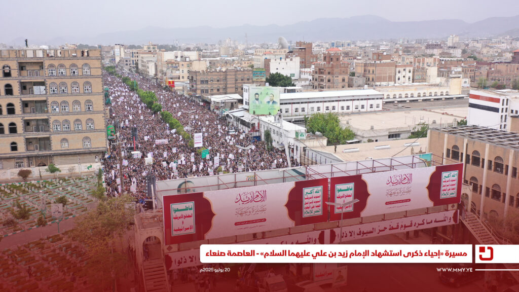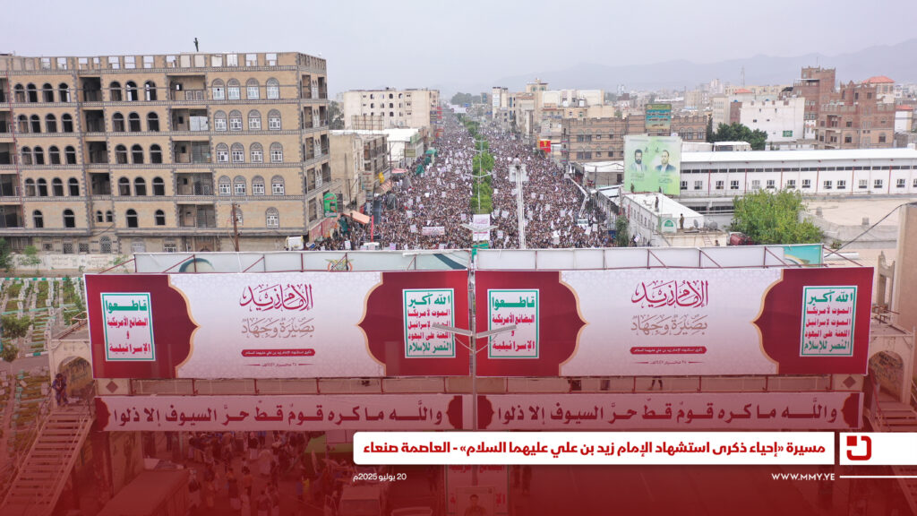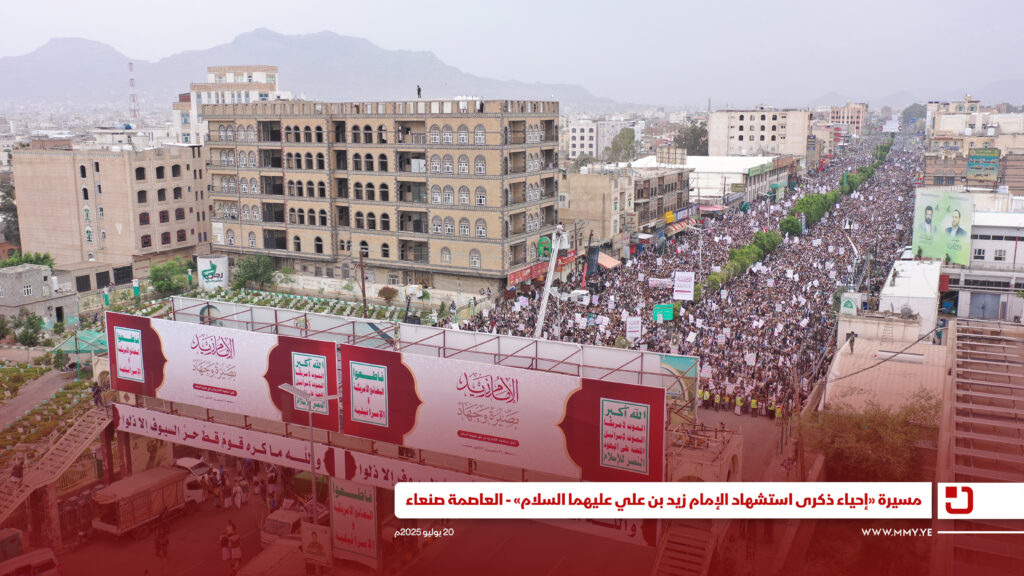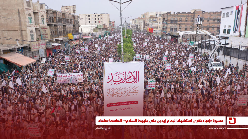 شهدت العاصمة صنعاء اليوم الأحد، 25 محرم 1447هـ الموافق 20 يوليو 2025م، مسيرة جماهيرية كبرى في شارع المطار إحياءً لذكرى استشهاد الإمام زيد بن علي -عليهما السلام- تحت شعار “بصيرة وجهاد”.