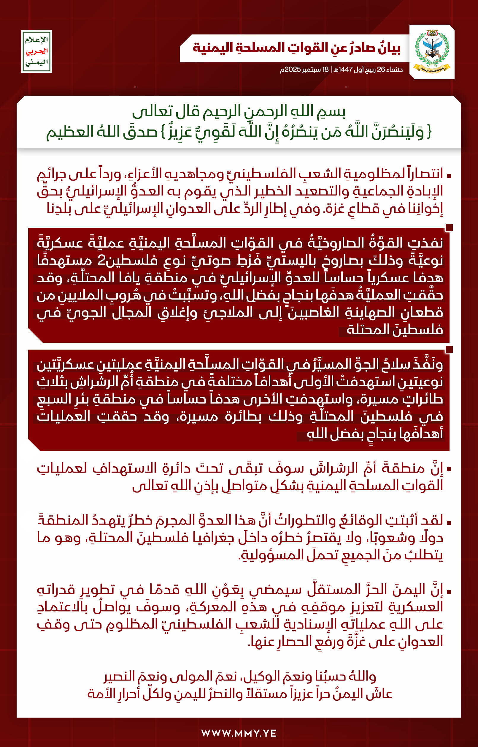 بيان القوات المسلحة اليمنية بشأن استهداف عدة أهداف حساسة للعدو الإسرائيلي في منطقة يافا وأم الرشراش وبئرِ السبعِ في فلسطين المحتلة بصاروخ باليستي فرط صوتي وعدد من الطائرات المسيرة – 18 سبتمبر 2025م