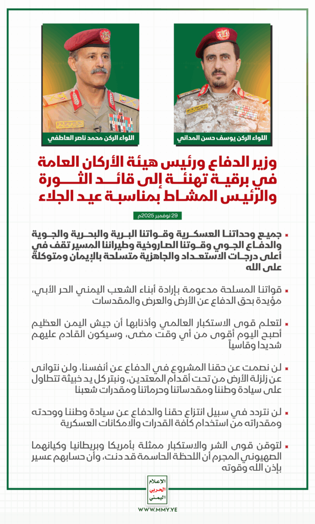 وزير الدفاع ورئيس هيئة الأركان العامة يهنئان قائد الثورة والرئيس مهدي المشاط بمناسبة عيد الجلاء – 29-11-2025م