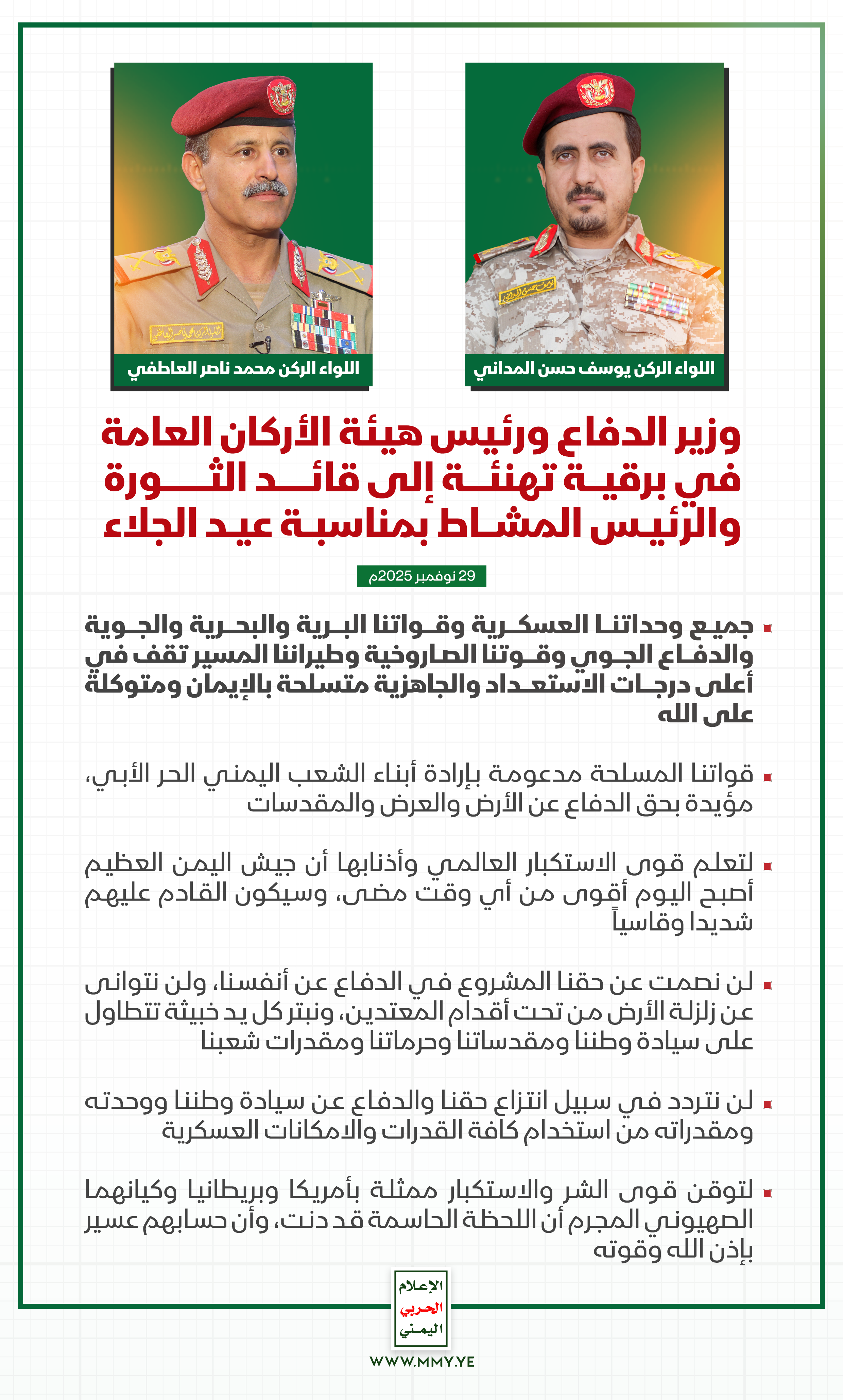 وزير الدفاع ورئيس هيئة الأركان العامة يهنئان قائد الثورة والرئيس مهدي المشاط بمناسبة عيد الجلاء – 29-11-2025م