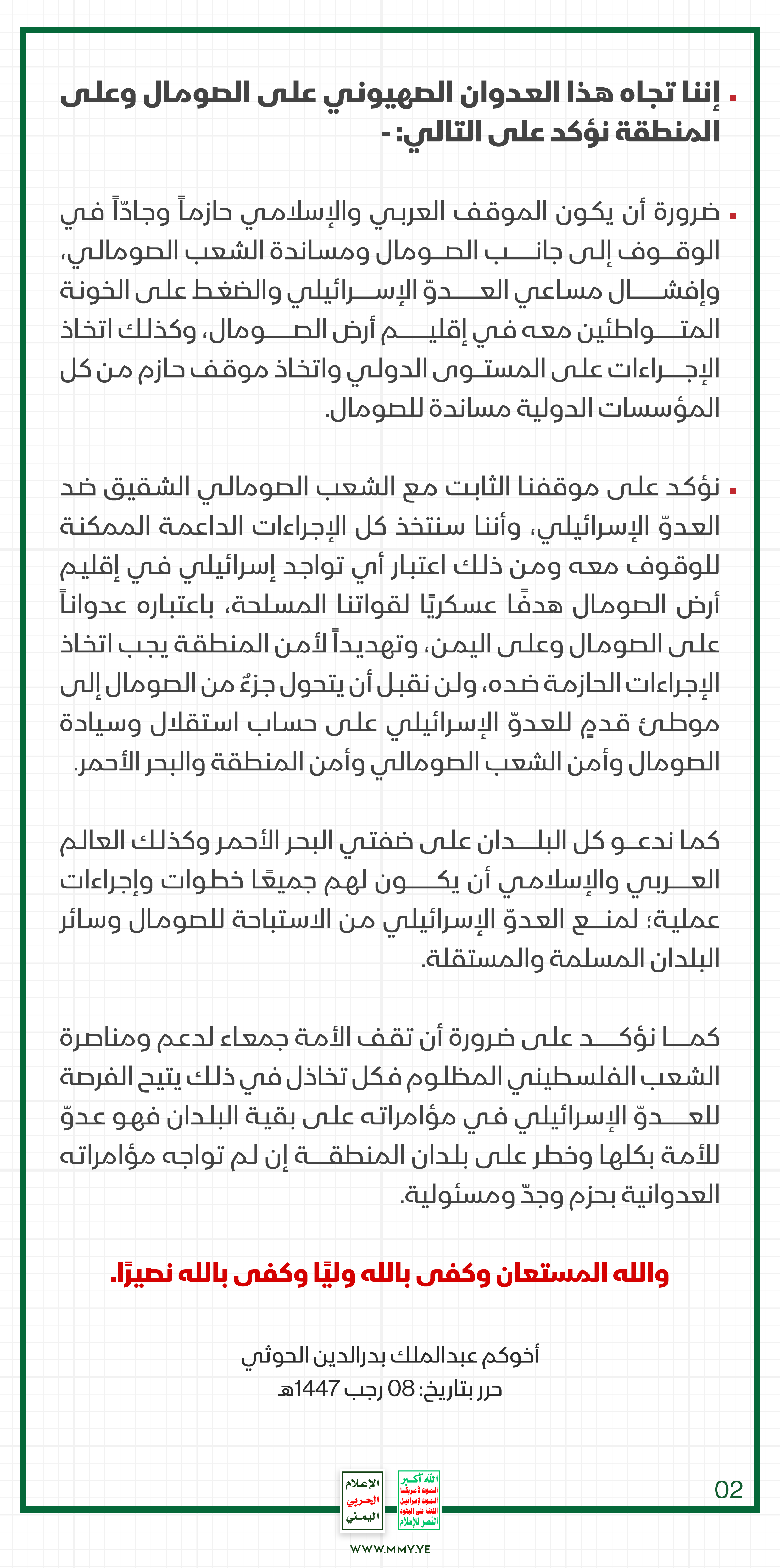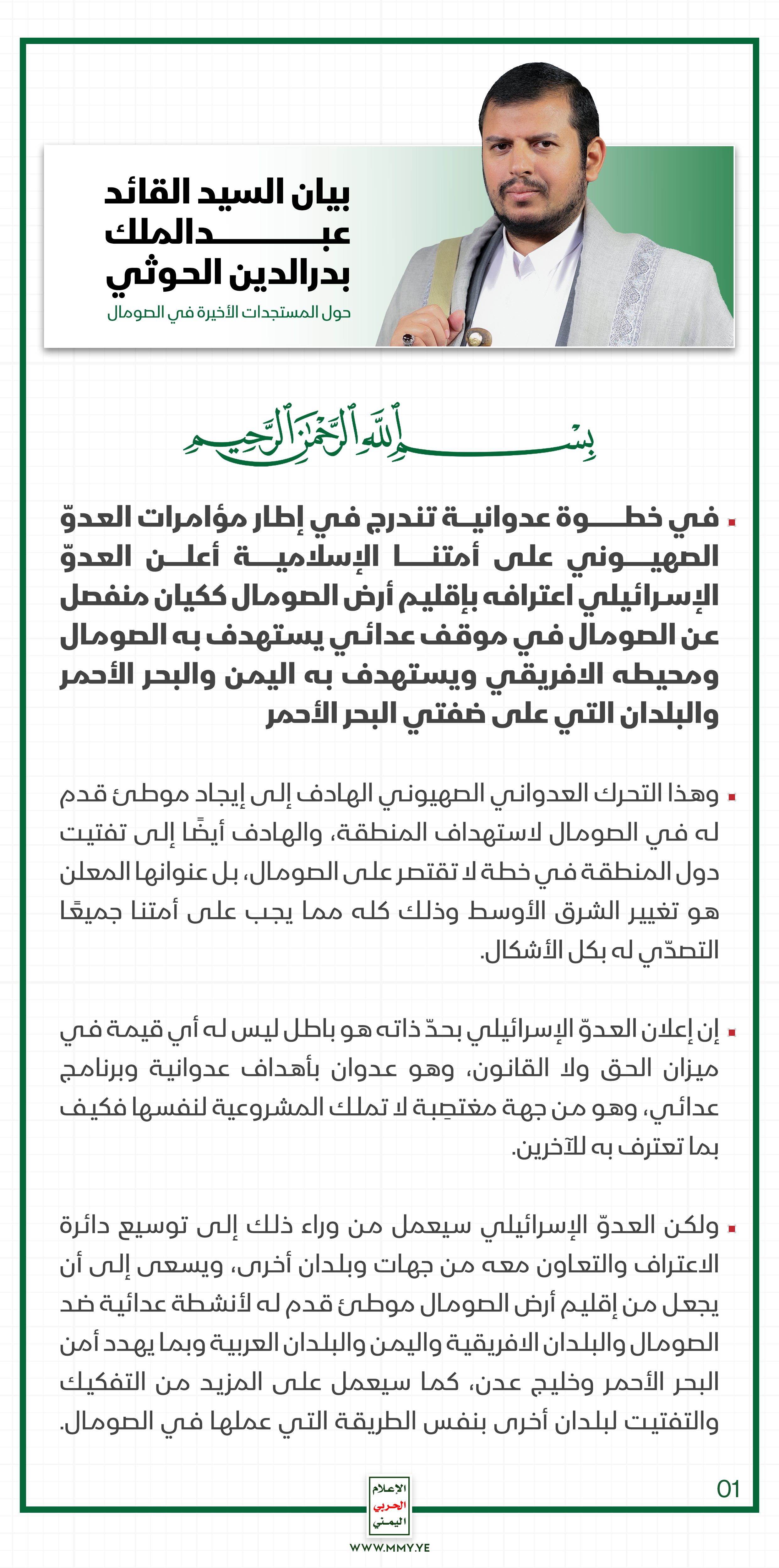 نؤكد على موقفنا الثابت مع الشعب الصومالي الشقيق ضد العدوّ الإسرائيلي، وأننا سنتخذ كل الإجراءات الداعمة الممكنة للوقوف معه ومن ذلك اعتبار أي تواجد إسرائيلي في إقليم أرض الصومال هدفًا عسكريًا لقواتنا المسلحة، باعتباره عدواناً على الصومال وعلى اليمن، وتهديداً لأمن المنطقة يجب اتخاذ الإجراءات الحازمة ضده، ولن نقبل أن يتحول جزءٌ من الصومال إلى موطئ قدمٍ للعدوّ الإسرائيلي على حساب استقلال وسيادة الصومال وأمن الشعب الصومالي وأمن المنطقة والبحر الأحمر.