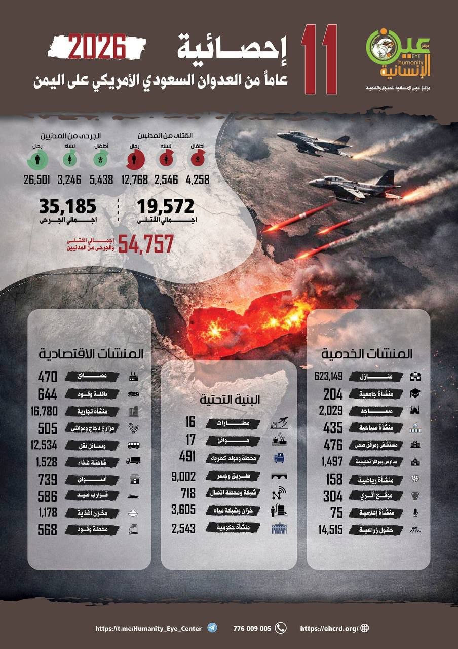 مركز عين الإنسانية: 11 عاماً من العدوان الأمريكي السعودي خلّفت عشرات الآلاف من الضحايا ودماراً واسعاً في البنية المدنية باليمن