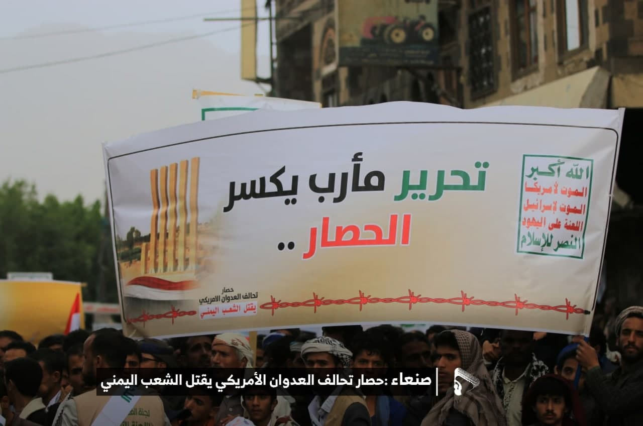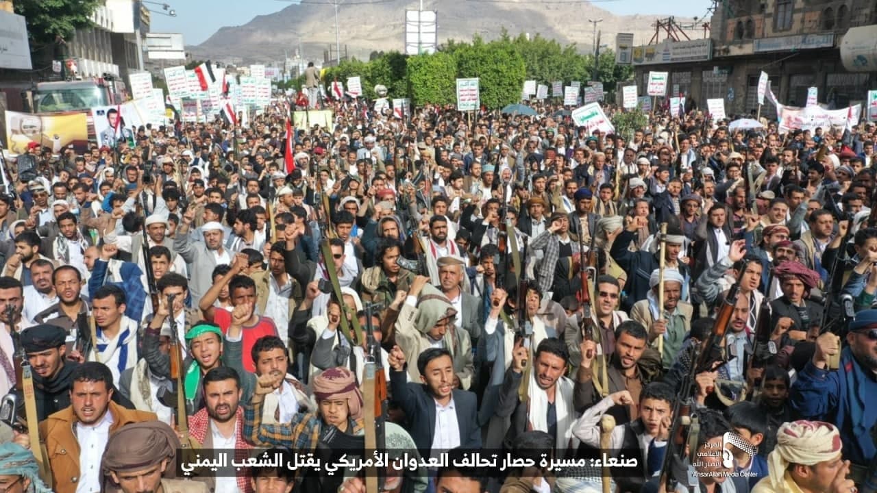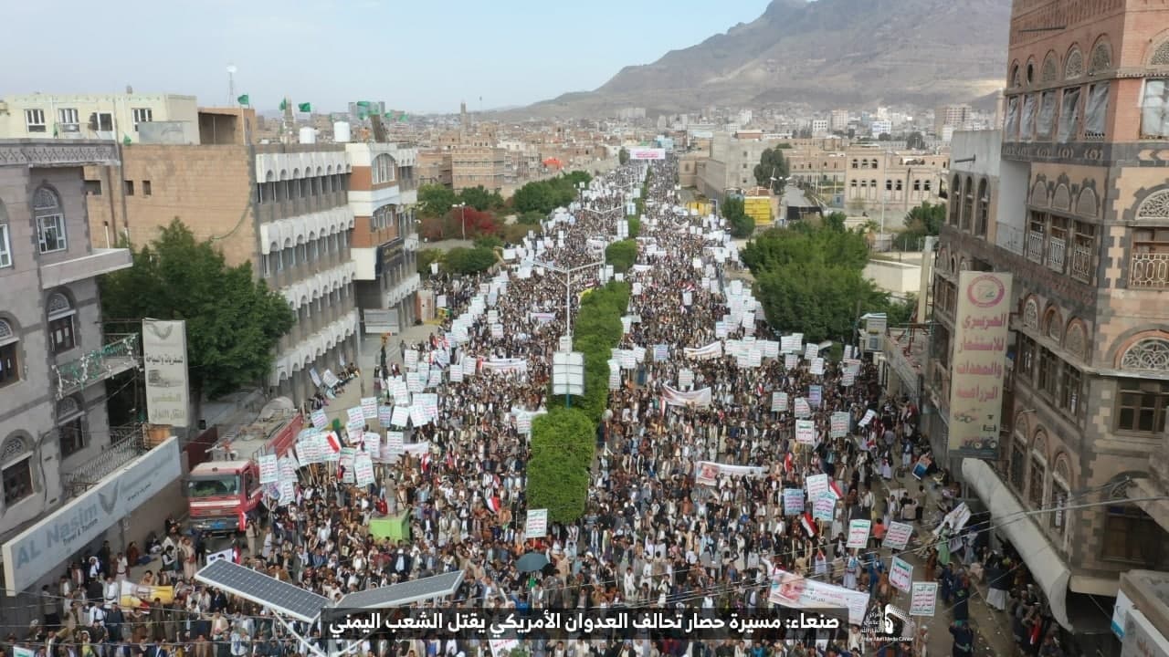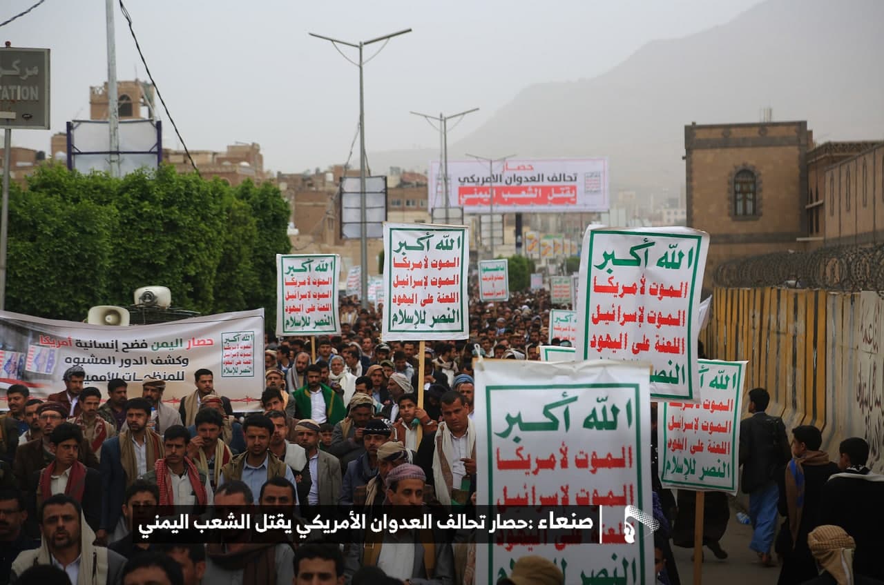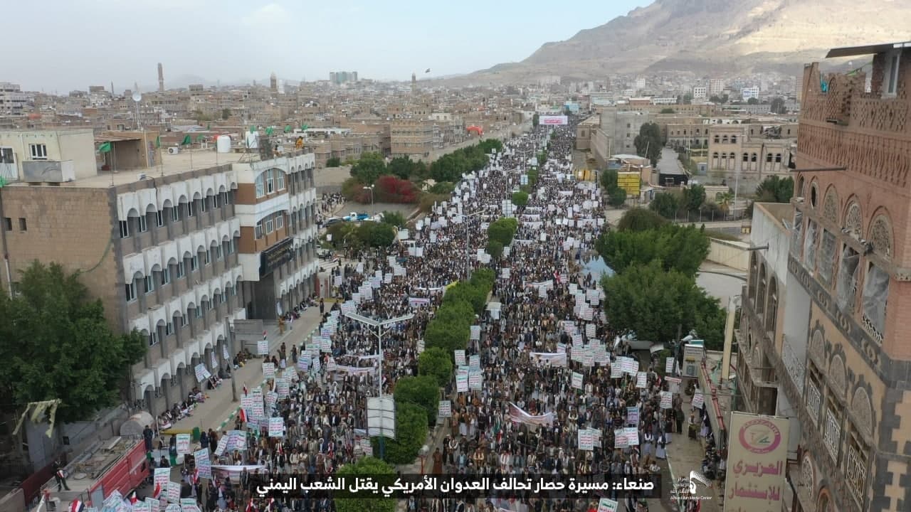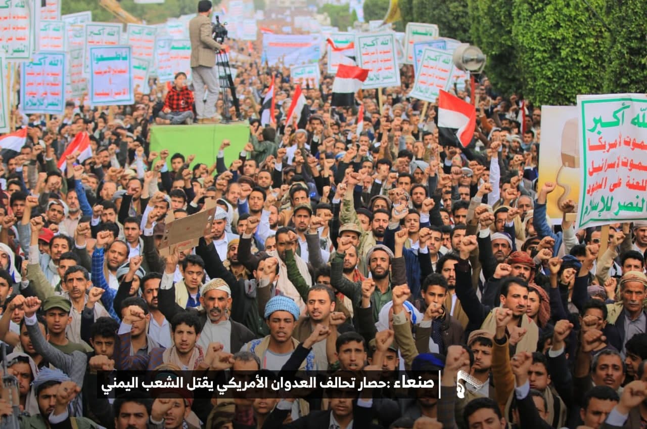 حيث شهدت العاصمة صنعاء عصر اليوم الجمعة: مسيرات غضب جماهيرية حاشدة تنديدا بحصار التحالف الأمريكي بحق الشعب اليمني، ورفضاً للعدوان والحصـار الأمريكي بحق الشعب اليمني وتأكيداً على حق الشعب اليمني في الدفاع عن نفسه وسيادته في وجه العربدة والاستكبار الأمريكي وأدواته