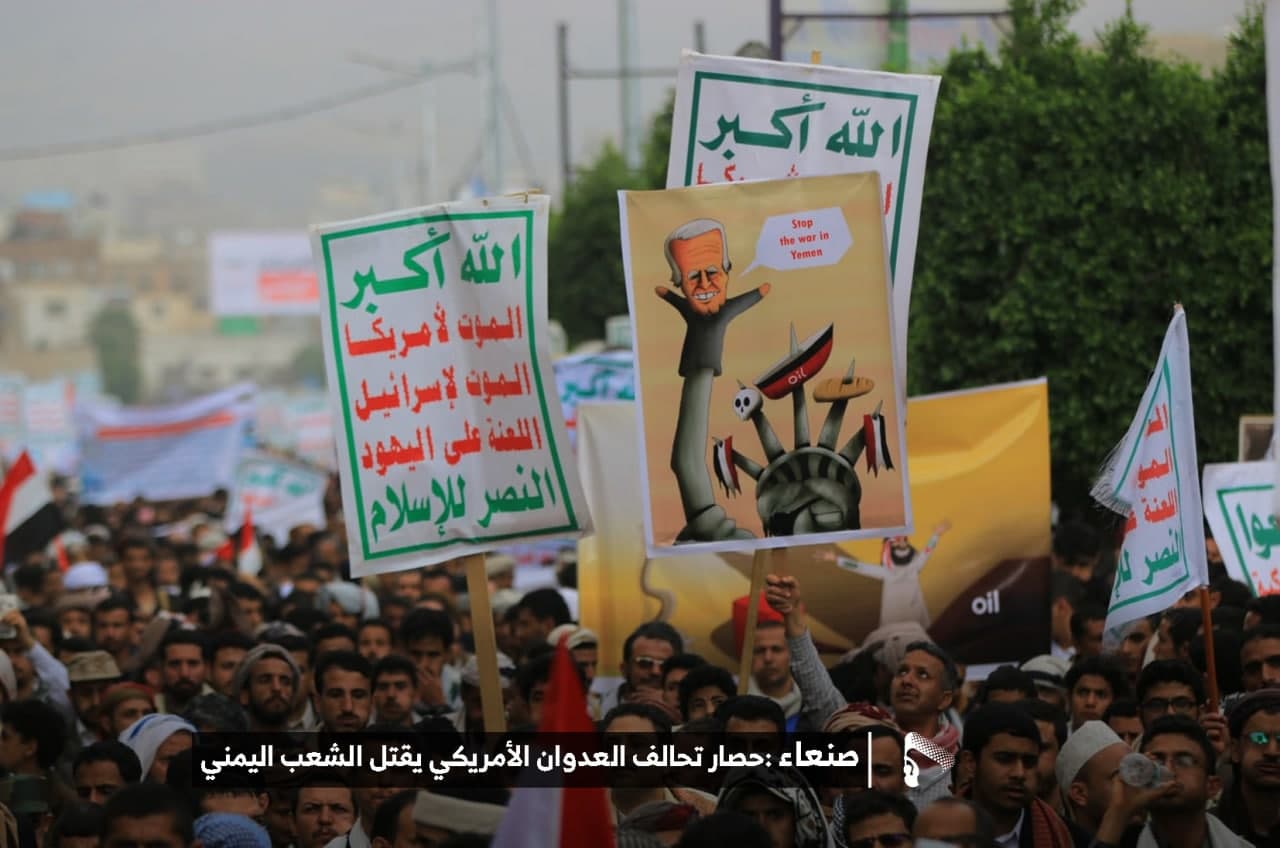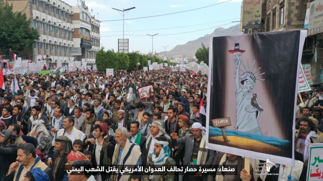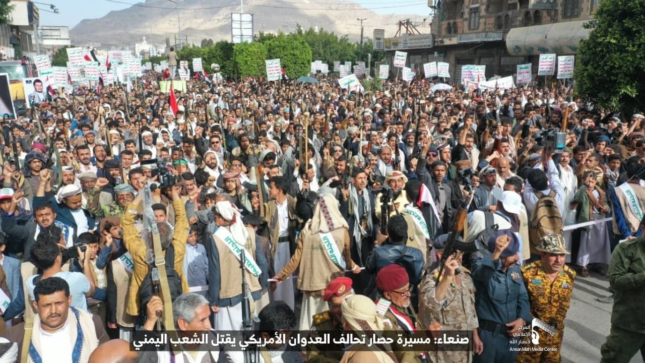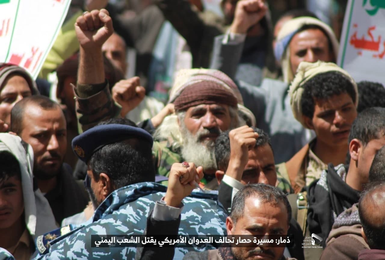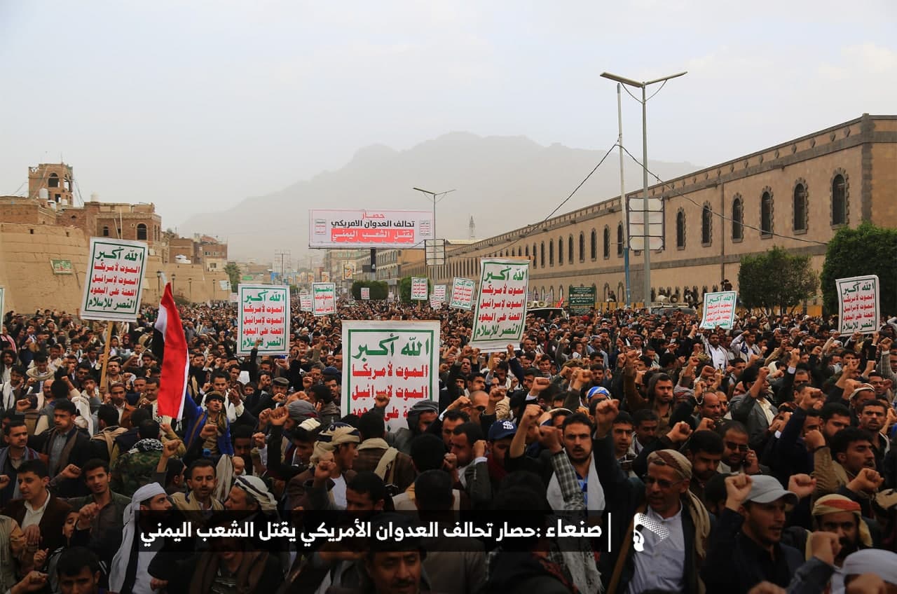 حيث شهدت العاصمة صنعاء عصر اليوم الجمعة: مسيرات غضب جماهيرية حاشدة تنديدا بحصار التحالف الأمريكي بحق الشعب اليمني، ورفضاً للعدوان والحصـار الأمريكي بحق الشعب اليمني وتأكيداً على حق الشعب اليمني في الدفاع عن نفسه وسيادته في وجه العربدة والاستكبار الأمريكي وأدواته