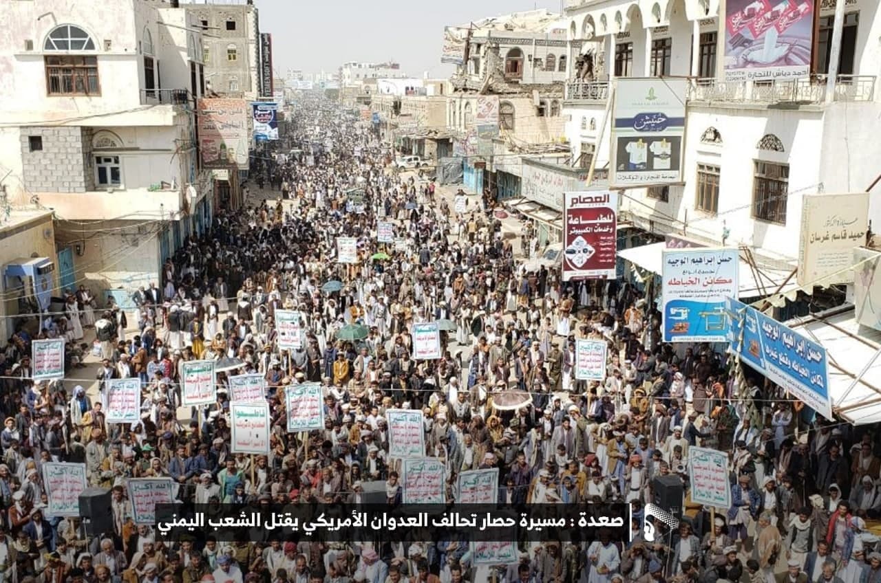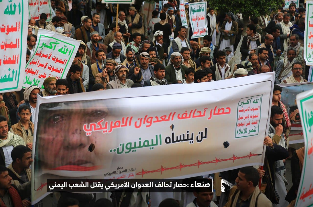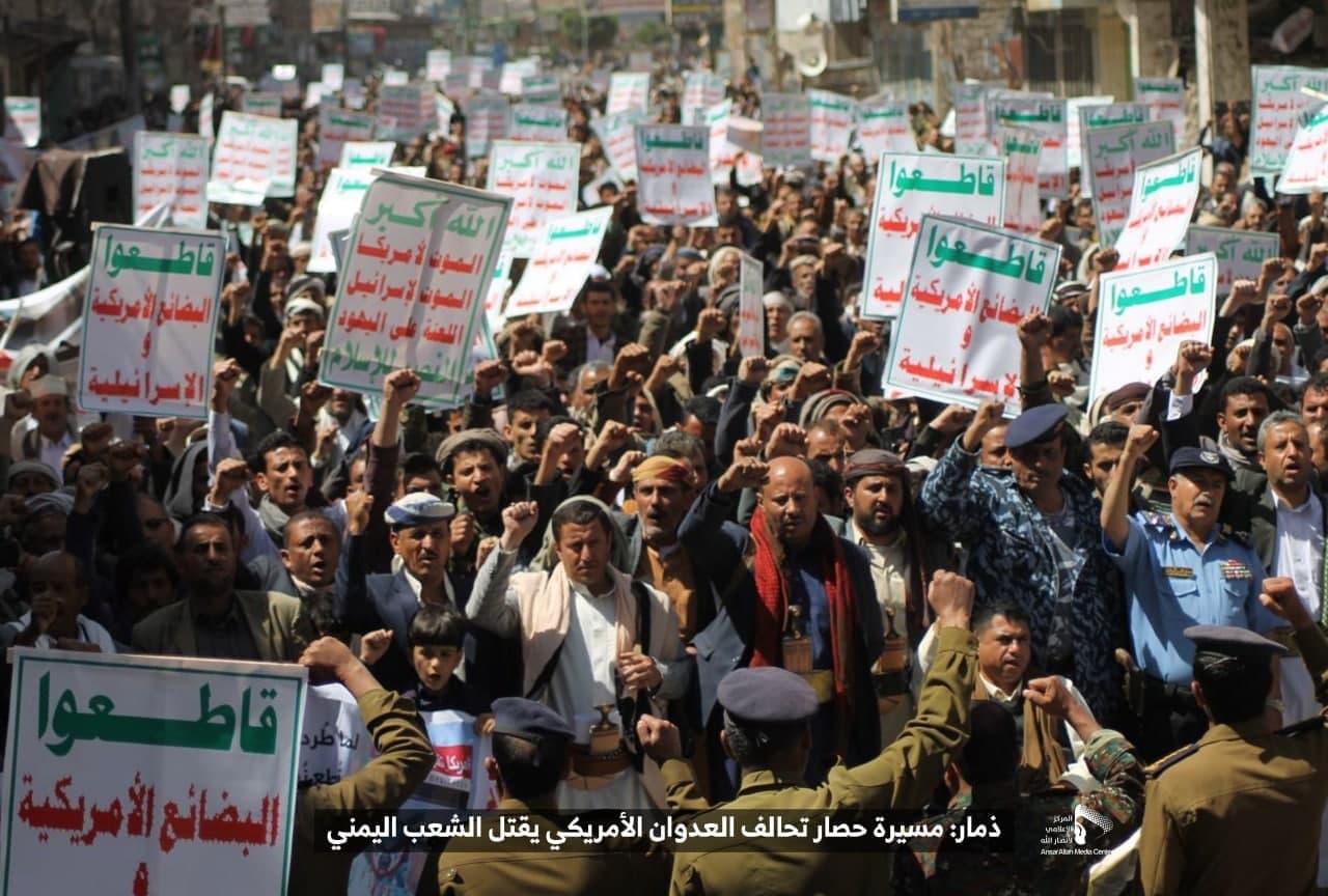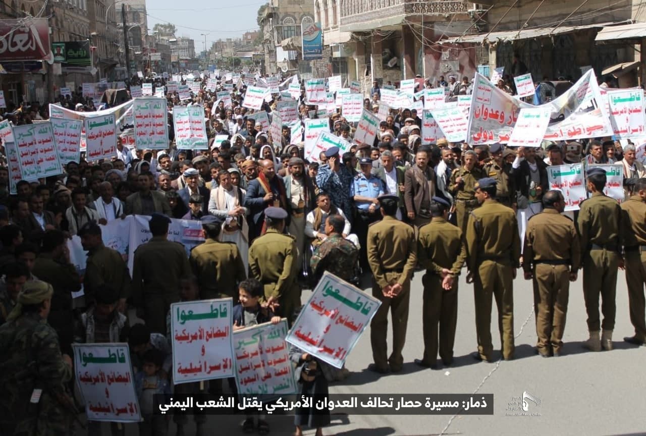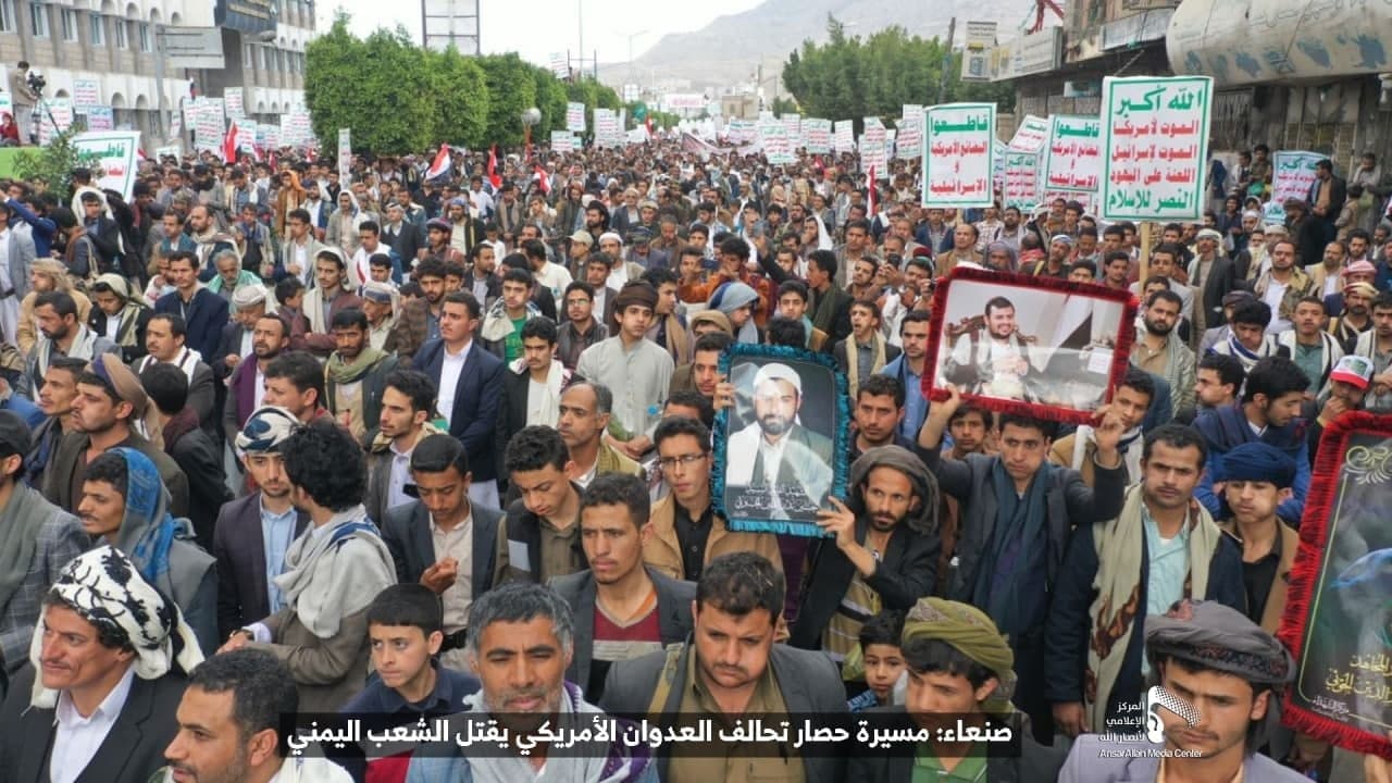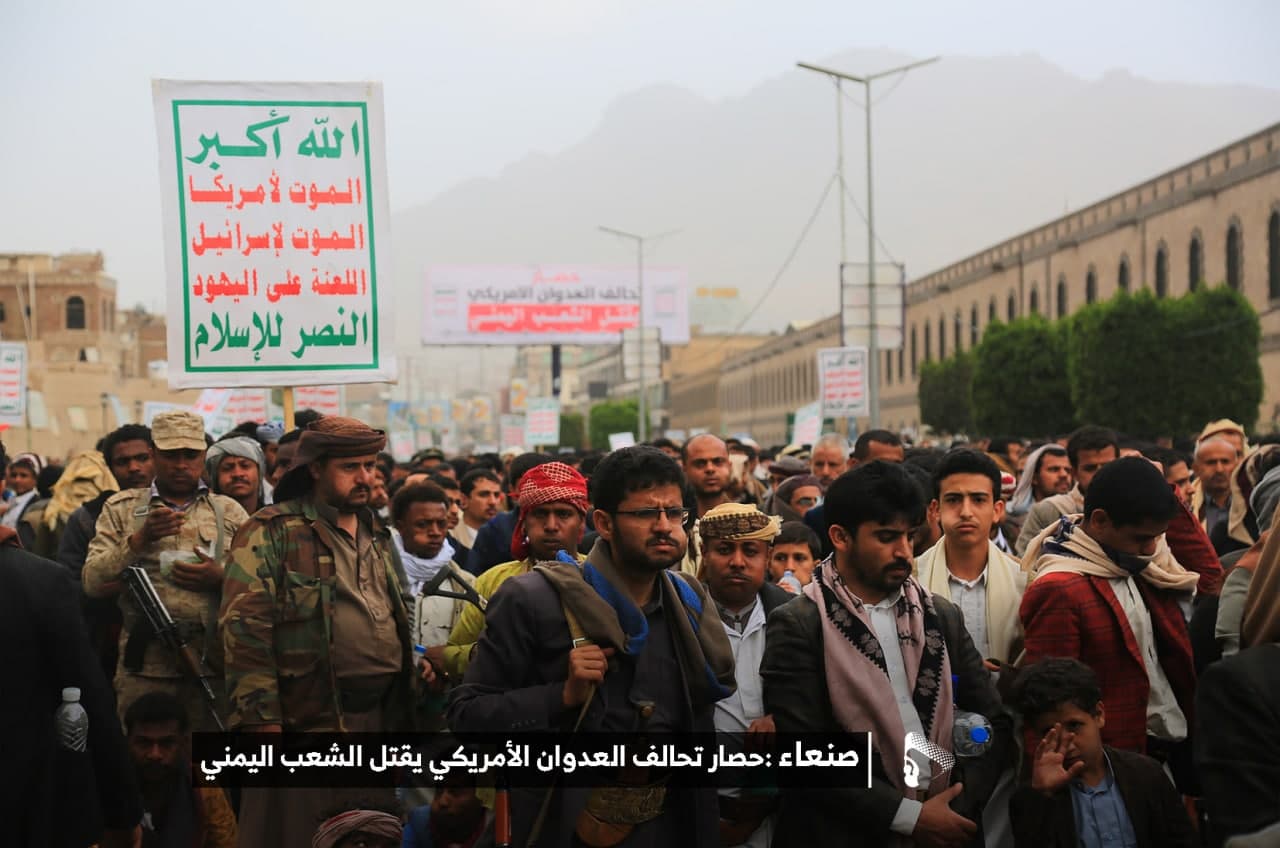 حيث شهدت العاصمة صنعاء عصر اليوم الجمعة: مسيرات غضب جماهيرية حاشدة تنديدا بحصار التحالف الأمريكي بحق الشعب اليمني، ورفضاً للعدوان والحصـار الأمريكي بحق الشعب اليمني وتأكيداً على حق الشعب اليمني في الدفاع عن نفسه وسيادته في وجه العربدة والاستكبار الأمريكي وأدواته