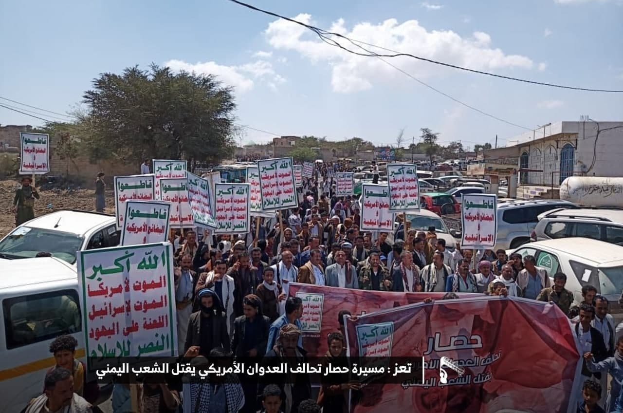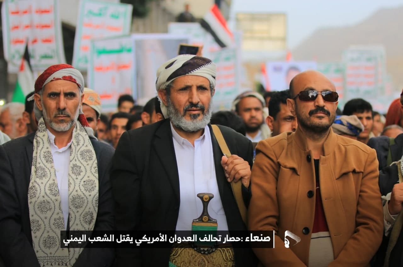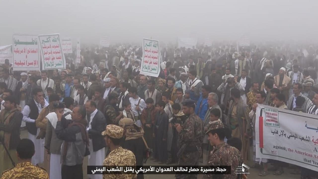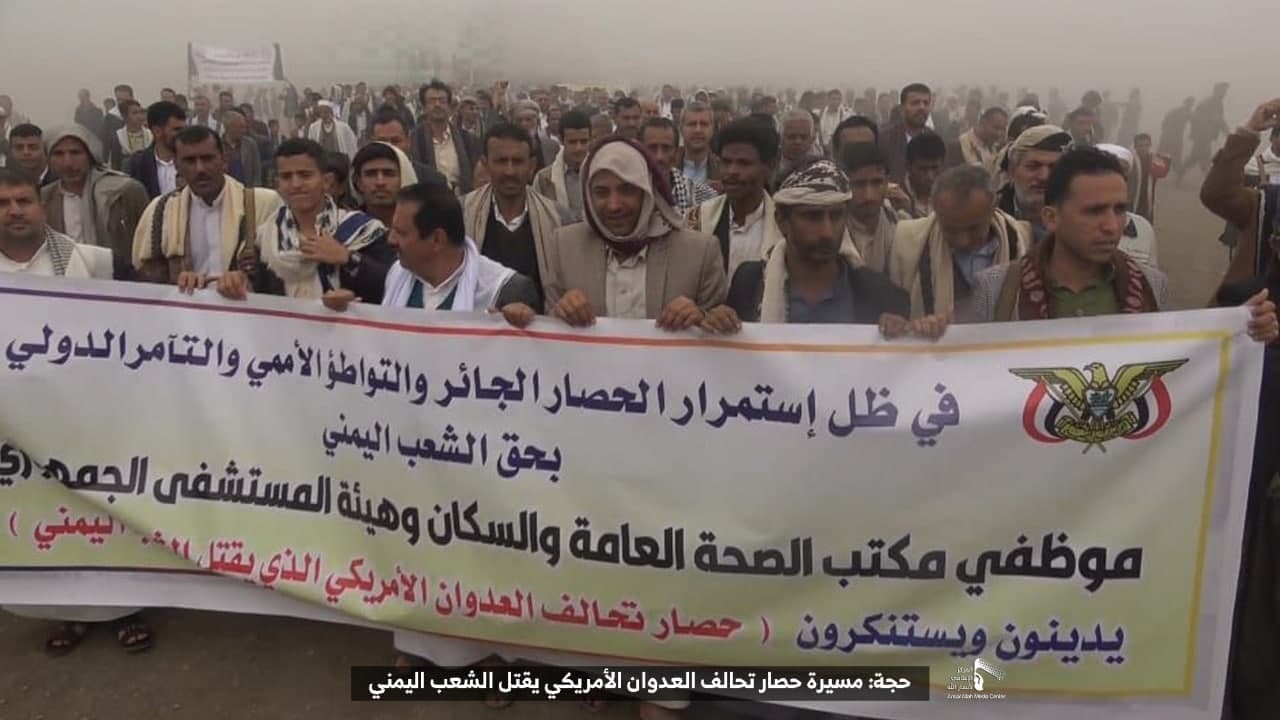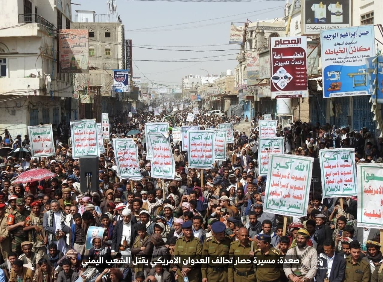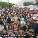 حيث شهدت العاصمة صنعاء عصر اليوم الجمعة: مسيرات غضب جماهيرية حاشدة تنديدا بحصار التحالف الأمريكي بحق الشعب اليمني، ورفضاً للعدوان والحصـار الأمريكي بحق الشعب اليمني وتأكيداً على حق الشعب اليمني في الدفاع عن نفسه وسيادته في وجه العربدة والاستكبار الأمريكي وأدواته