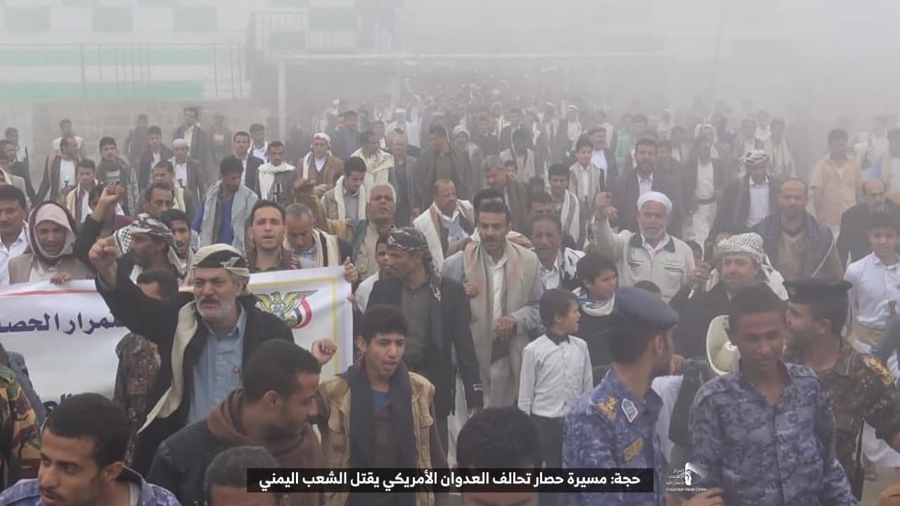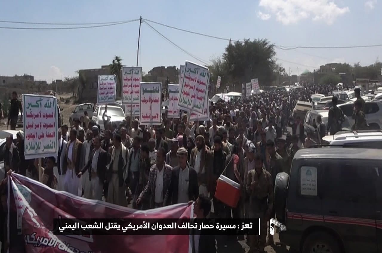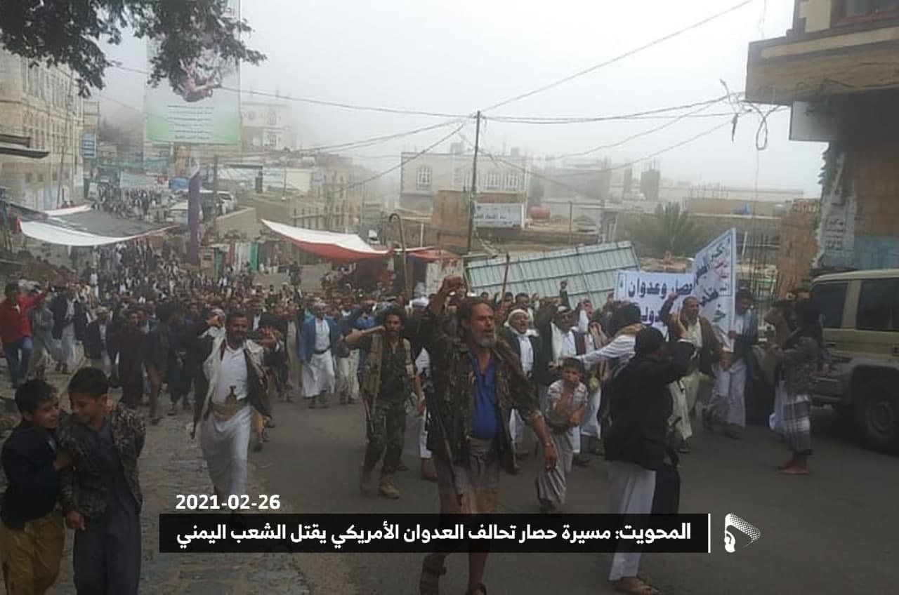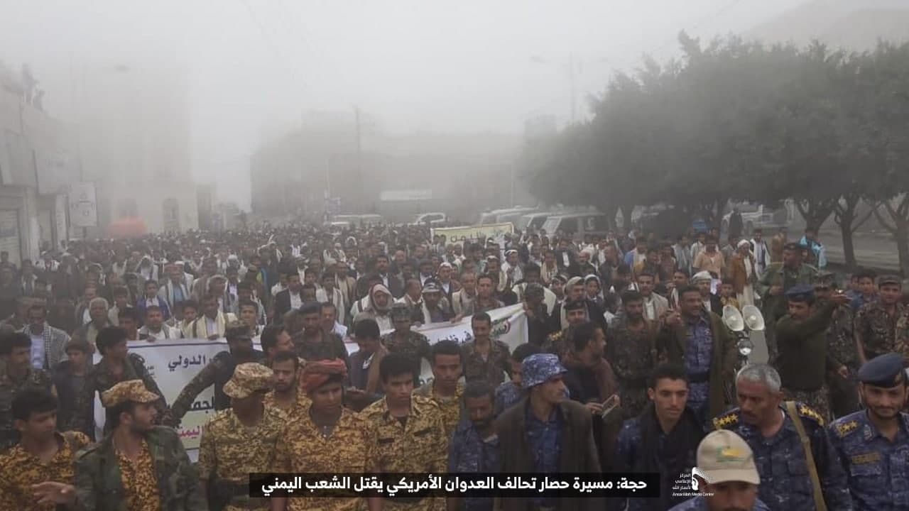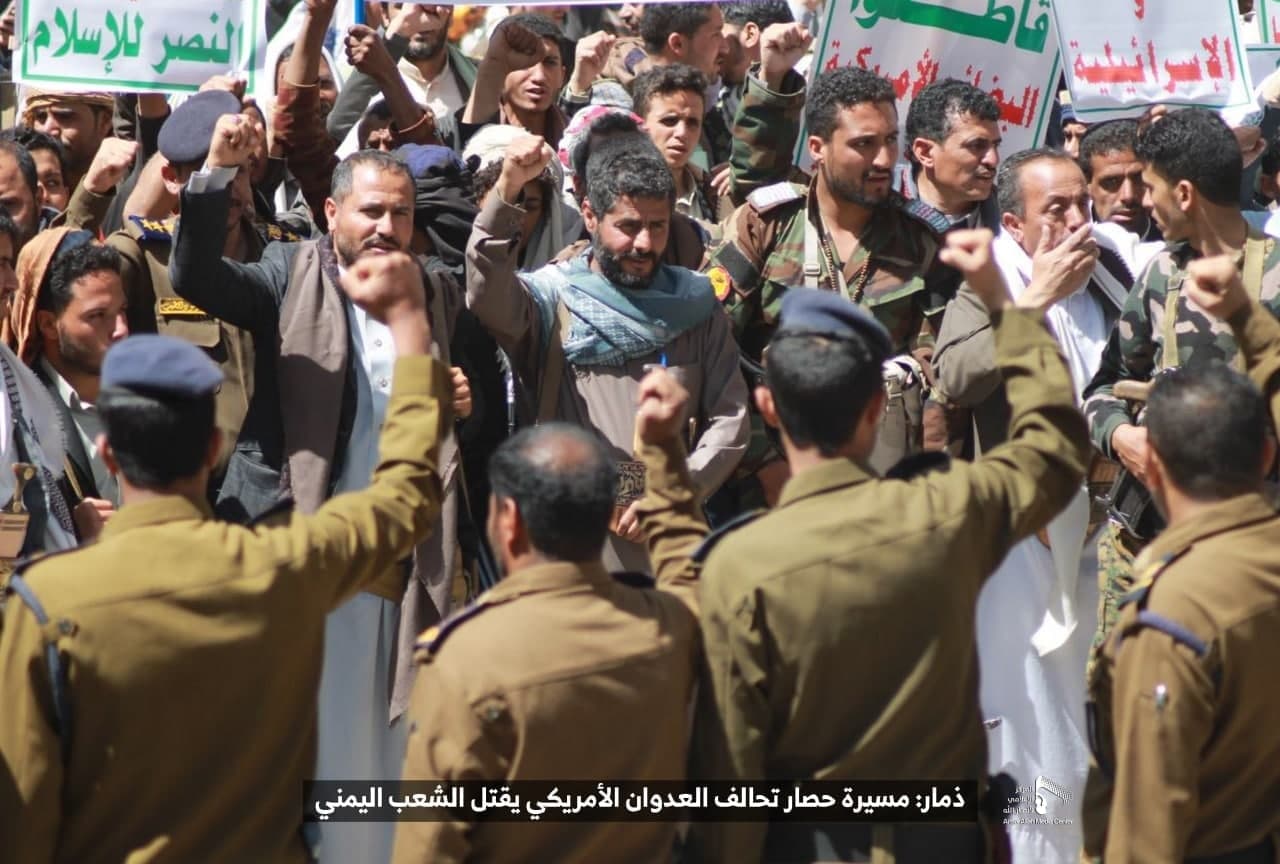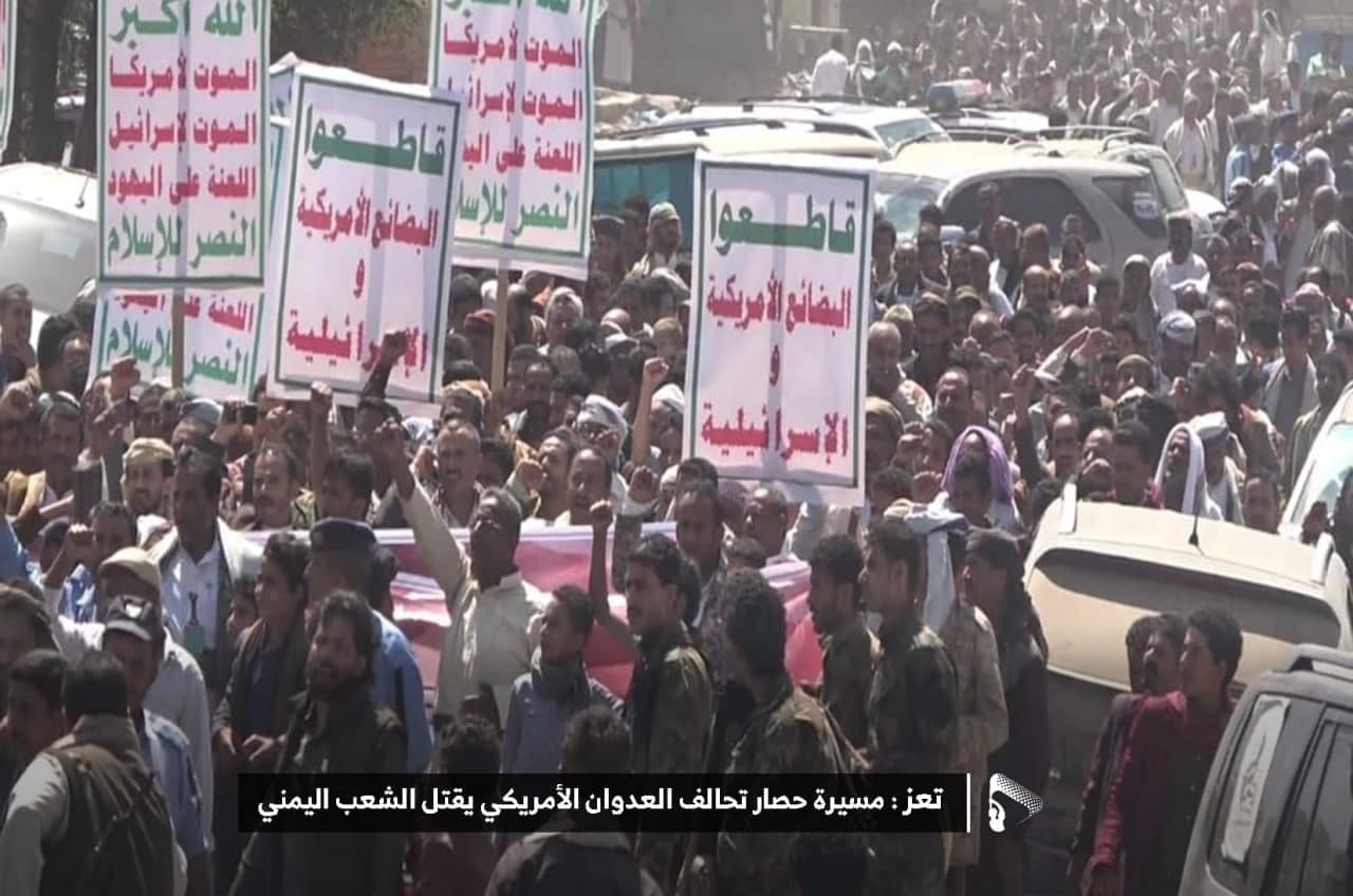 حيث شهدت العاصمة صنعاء عصر اليوم الجمعة: مسيرات غضب جماهيرية حاشدة تنديدا بحصار التحالف الأمريكي بحق الشعب اليمني، ورفضاً للعدوان والحصـار الأمريكي بحق الشعب اليمني وتأكيداً على حق الشعب اليمني في الدفاع عن نفسه وسيادته في وجه العربدة والاستكبار الأمريكي وأدواته