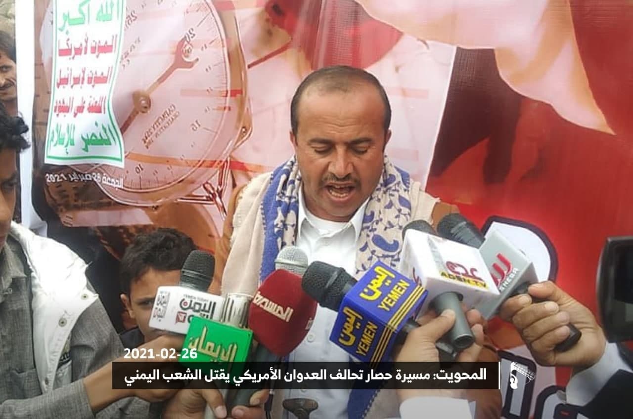 وتلا محمد الحميري بيان المسيرة الذي أكد فيه “إن الحصار الأمريكي جريمة إبادة جماعية، وما يسمى بالمجتمع الدولي والأمم المتحدة متواطئون مع الجلاد ضد الضحية”، مؤكدًا أن ما تروج له دول العدوان عن تقديمها مساعدات إنسانية إنما هو تضليل خبيث للتعمية على حصارها الظالم للشعب اليمني.