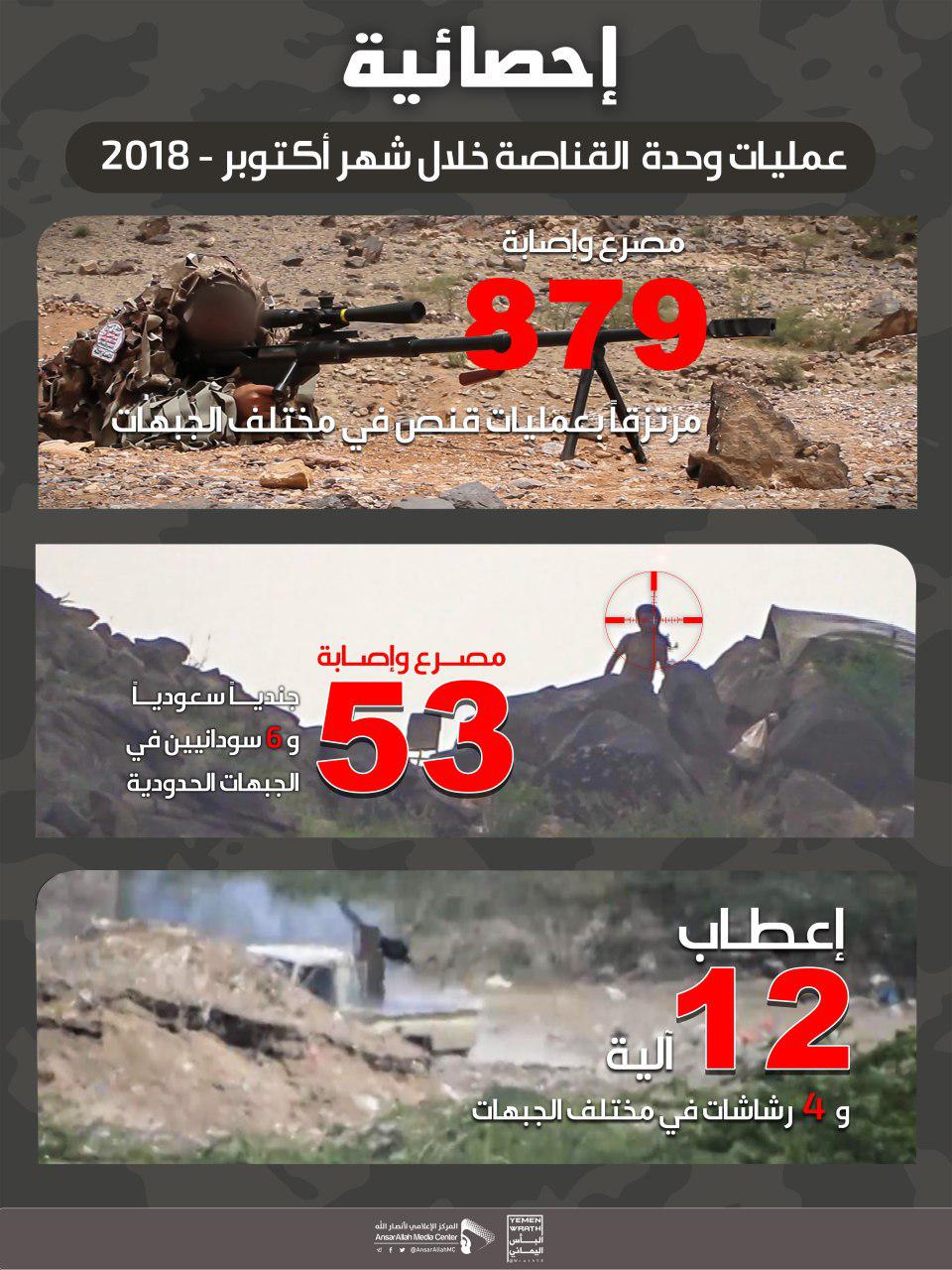 قتل وجرح أكثر من 863 جندي سعودي وسوداني ومنافق بينما أُعطب طقم 12 و4 معدلات للغزاة والمنافقين بعمليات قنص نفذتها وحدة القناصة للجيش واللجان الشعبية في مختلف جبهات القتال خلال شهر أكتوبر الفائت.