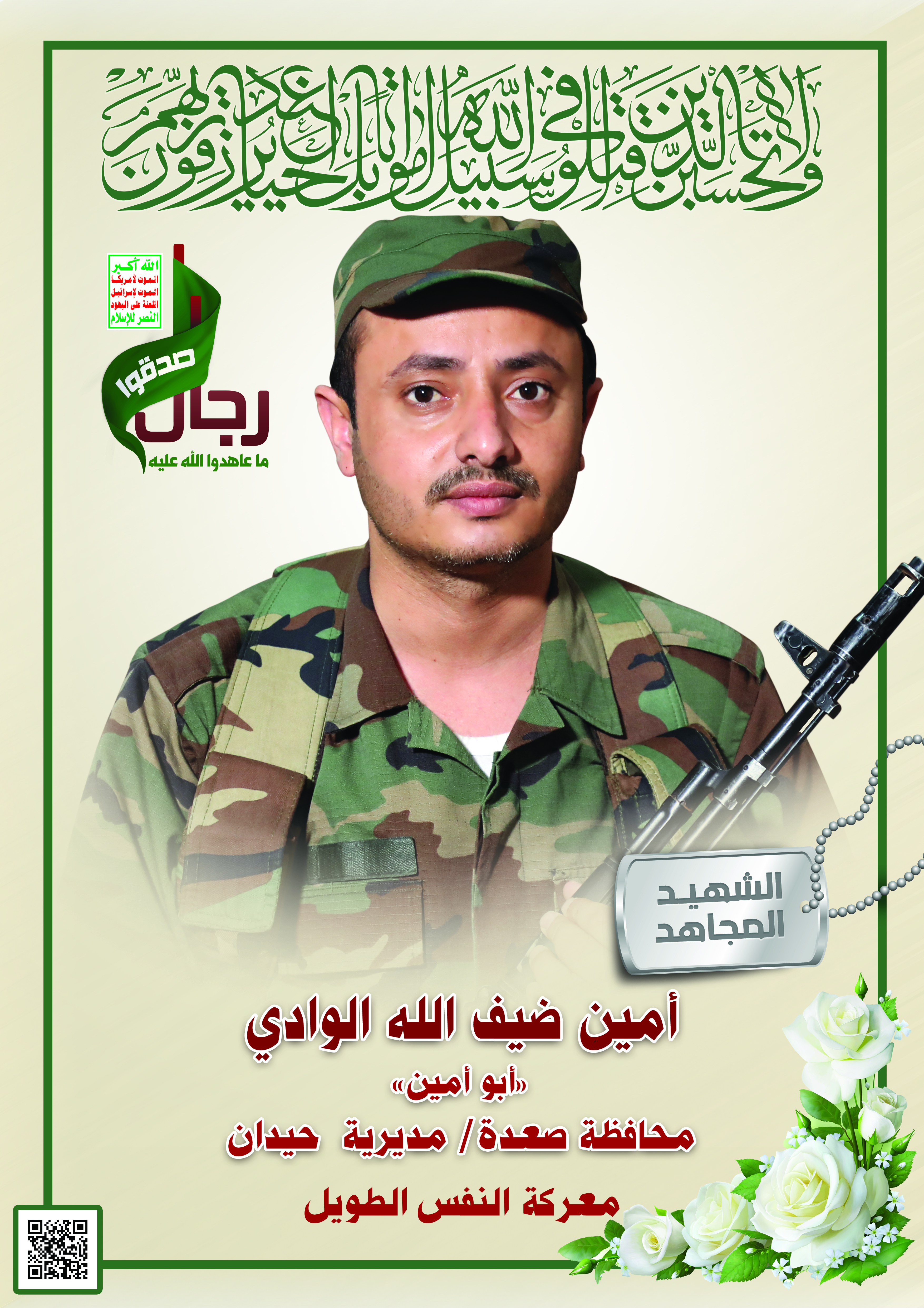 Actor أمين ضيف الله عبدالله محمد محمد الوادي Filmography الشهيد المجاهد: أمين ضيف الله عبدالله محمد محمد الوادي – أبو أمين المحافظة: صعدة المديرية: حيدان – مران معركة النفس الطويل رقم الحافظة: 120006 FILMOGRAPHY icon نواة النصر “رجال صدقوا ما عاهدوا الله عليه” – الإعلام الحربي 1443هـ 22/12/2021 15/12/2022 icon نشيد سلاماً | فرقة انصار الله 1443 هـ 17/12/2021 21/12/2021 icon لكم الخلود || الشهيد/ أمين ضيف الله عبدالله محمد الوادي – (أبو أمين) 12/11/2021 12/12/2021