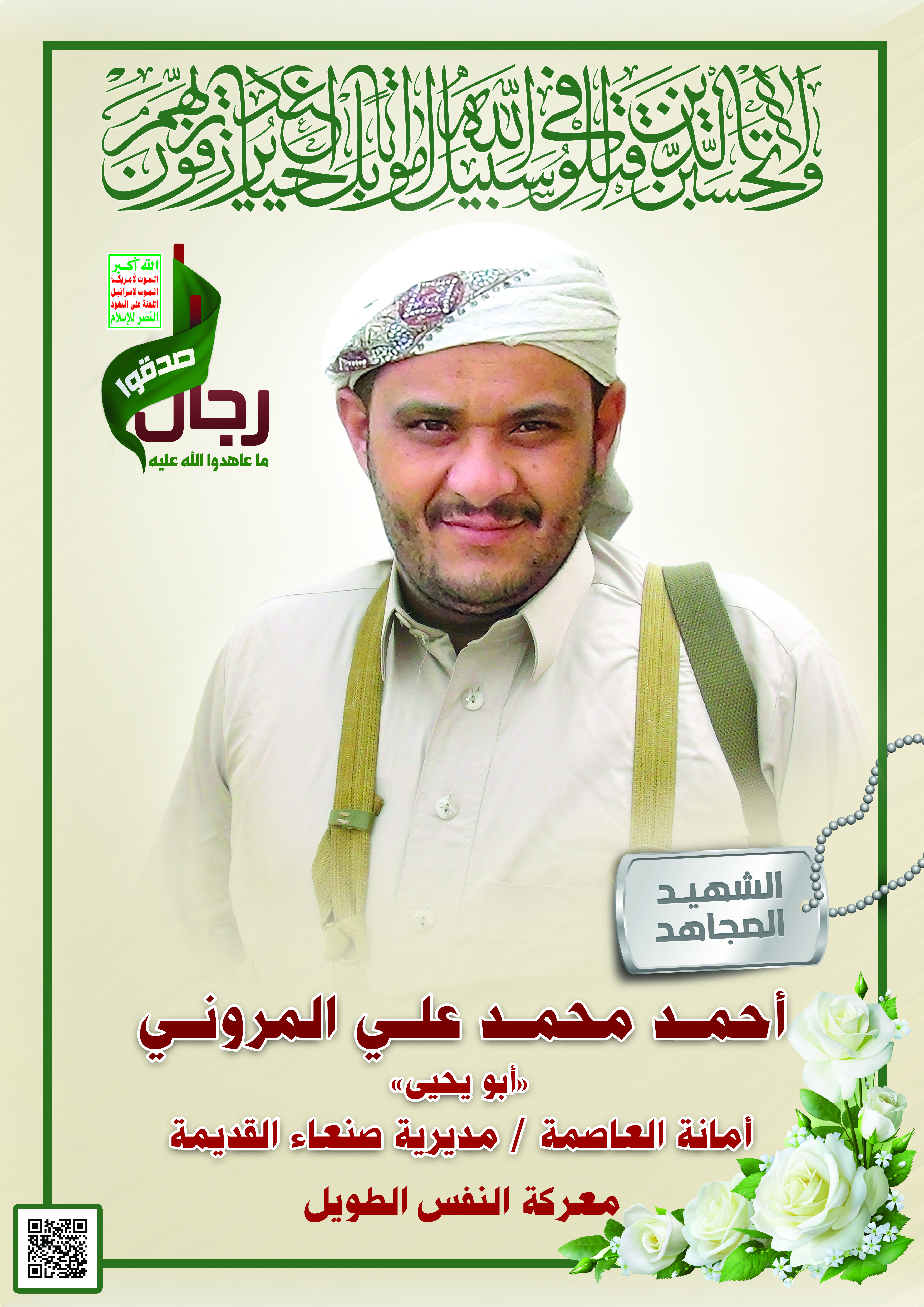Actor أحمد محمد علي المروني Filmography الشهيد المجاهد: أحمد محمد علي المروني – أبو يحيى المحافظة: الأمانة المديرية: صنعاء القديمة – معركة النفس الطويل رقم الحافظة: 123014 FILMOGRAPHY icon الشهيد المجاهد أحمد محمد علي المروني “أبو يحيى” 04/04/2018 12/12/2021