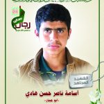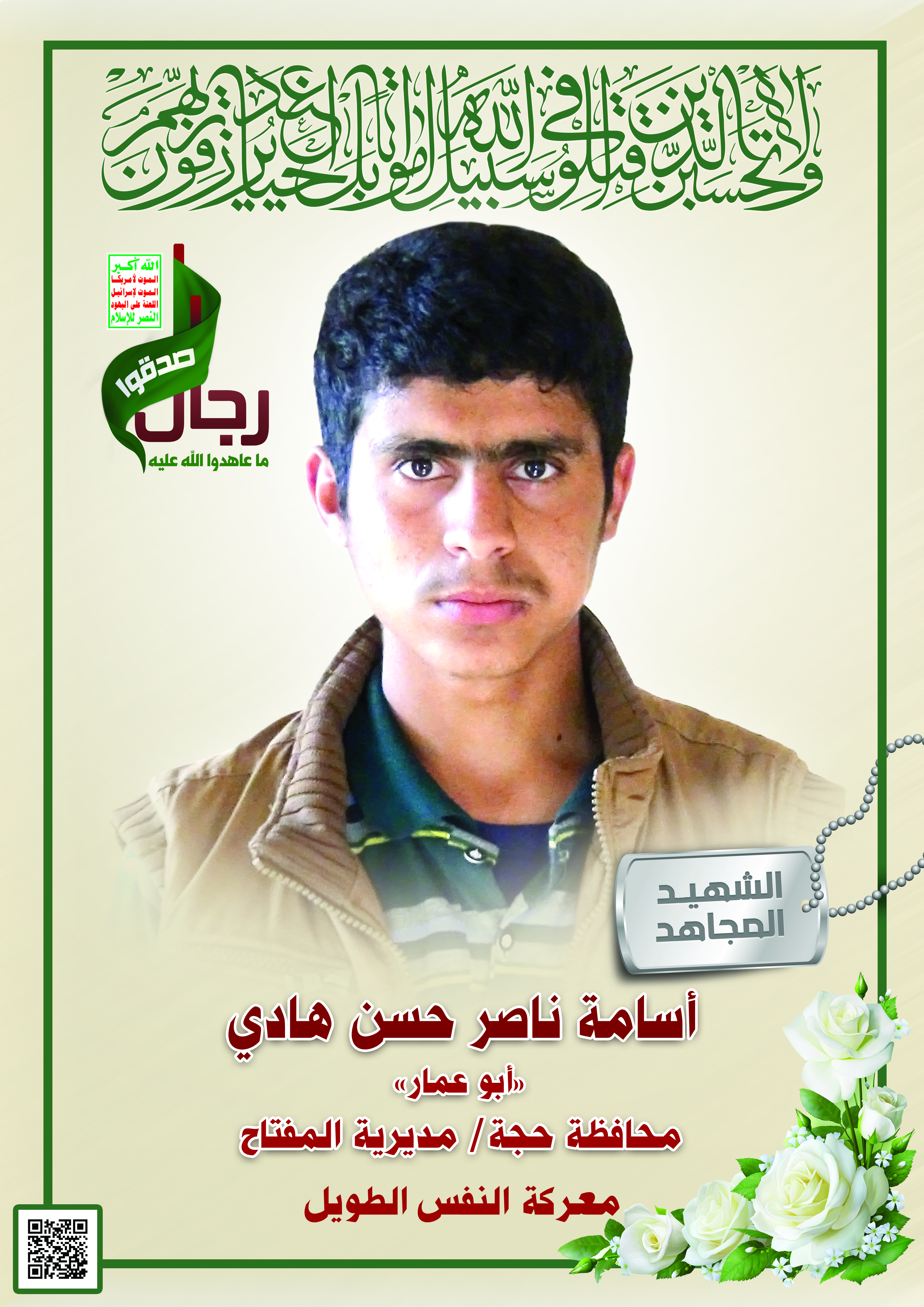 Actor أسامة ناصر حسن حسن هادي Filmography الشهيد المجاهد: أسامة ناصر حسن حسن هادي – أبو عمار المحافظة: حجة المديرية: المفتاح – بني محرم معركة النفس الطويل رقم الحافظة: 123019 FILMOGRAPHY icon الشهيد المجاهد أسامه ناصر حسن حسن هادي – “أبو عمار” 30/11/2016 25/11/2021