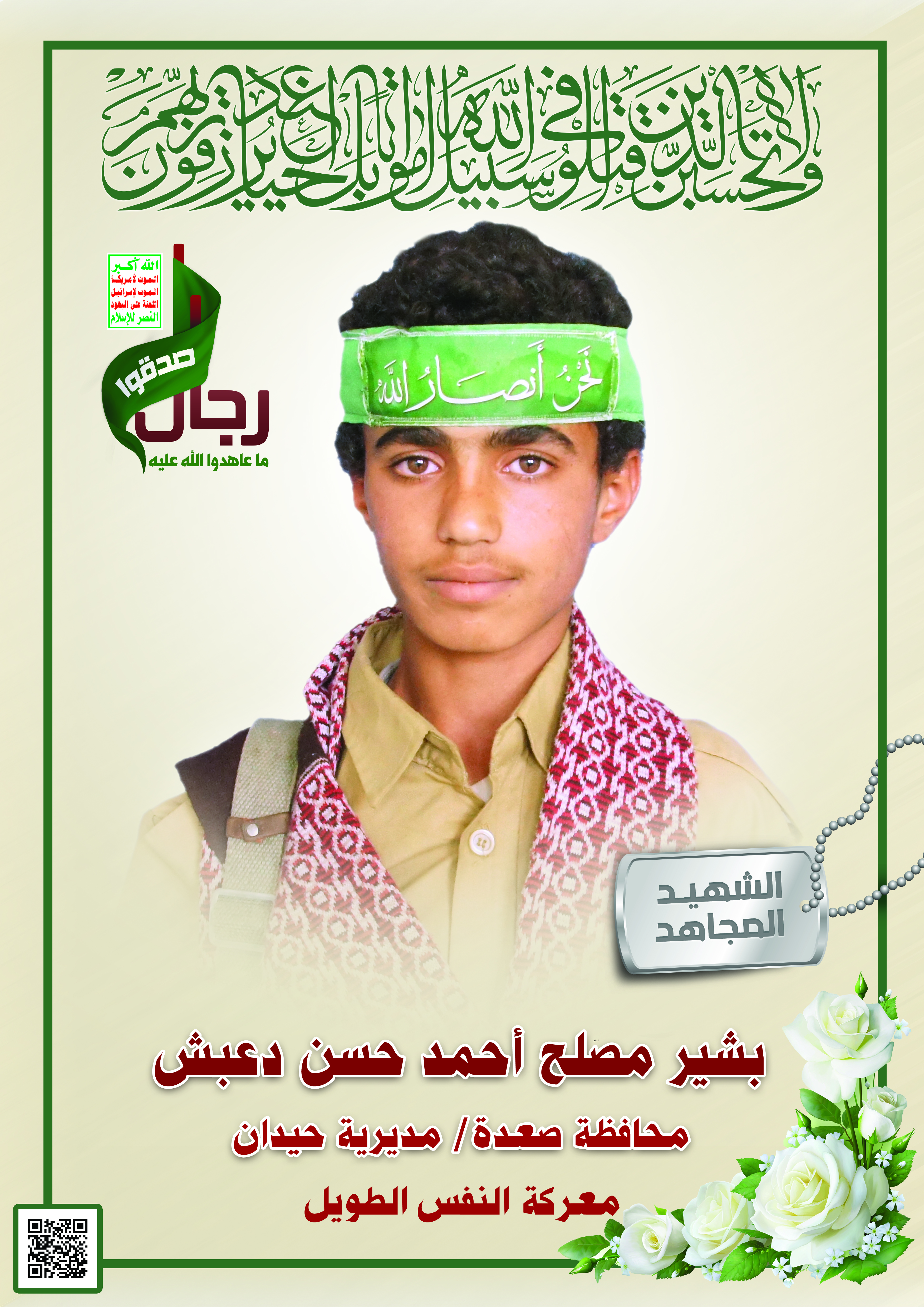Actor بشير مصلح أحمد حسن دعبش Filmography SONY DSC SONY DSC SONY DSC الشهيد المجاهد: بشير مصلح أحمد حسن دعبش – المحافظة: صعدة المديرية: حيدان – جبل زبيد معركة النفس الطويل رقم الحافظة: 123027