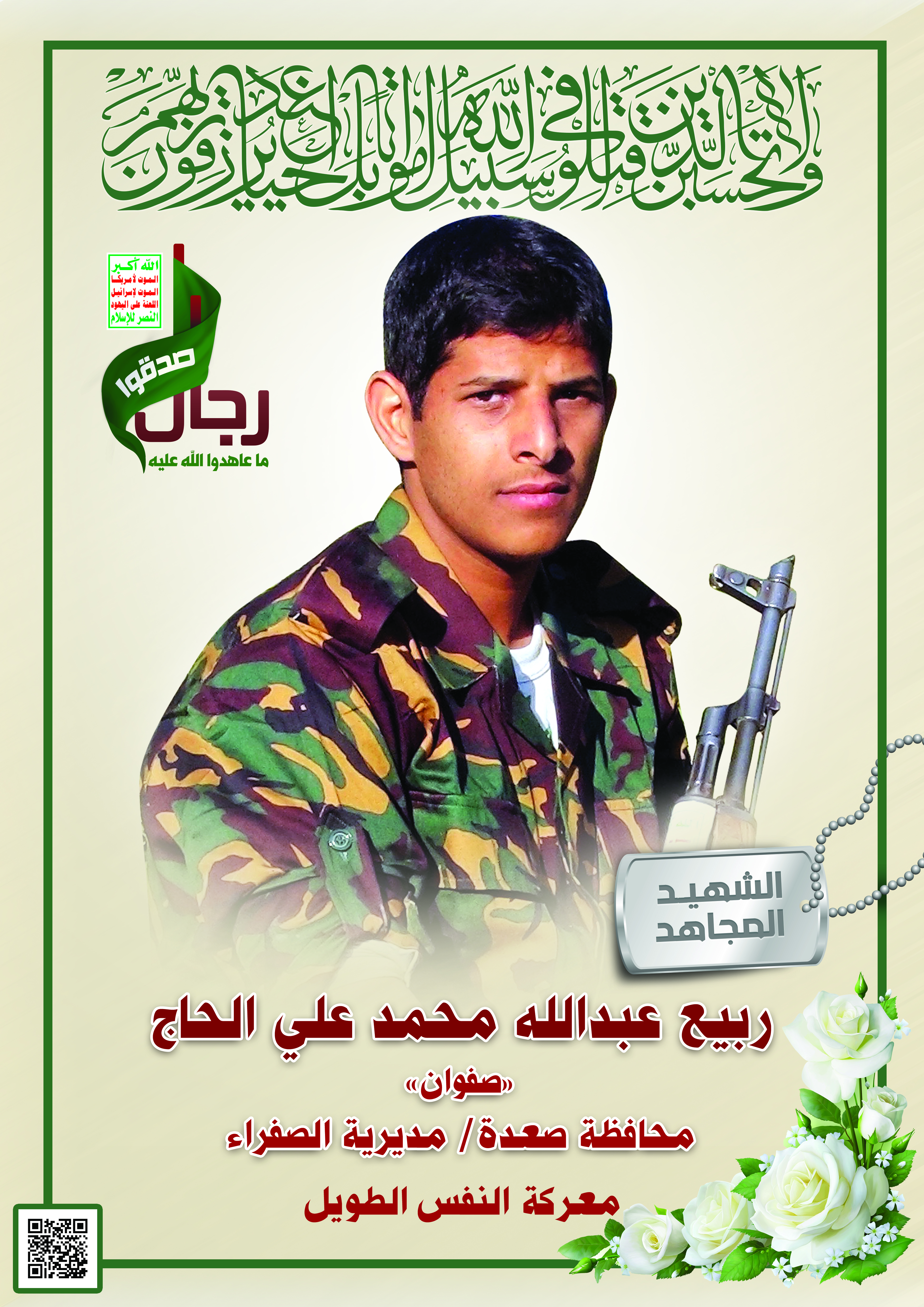 Actor ربيع عبدالله محمد علي ناصر الحاج Filmography الشهيد المجاهد: ربيع عبدالله محمد علي ناصر الحاج – صفوان المحافظة: صعدة المديرية: الصفراء – عكوان معركة النفس الطويل رقم الحافظة: 123050 FILMOGRAPHY icon لكم الخلود – الشهيد ربيع عبدالله محمد الحاج (صفوان) 14/12/2021