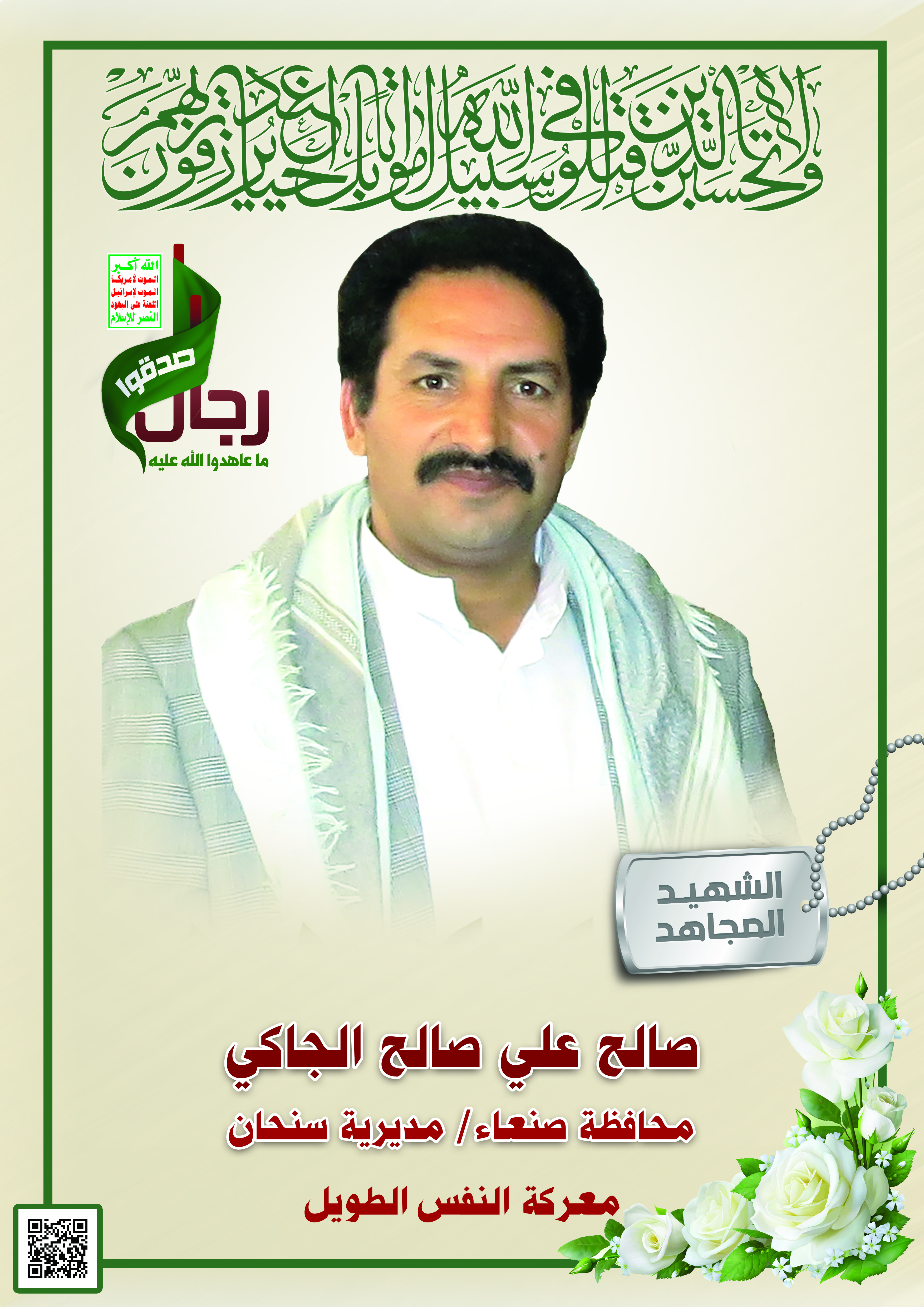 Actor صالح علي صالح الجاكي Filmography الشهيد المجاهد: صالح علي صالح الجاكي – المحافظة: صنعاء المديرية: سنحان – وادي الاجبار معركة النفس الطويل رقم الحافظة: 123071 FILMOGRAPHY icon الشهيد المجاهد “ صالح علي صالح الجاكي” 23/01/2019 24/11/2021