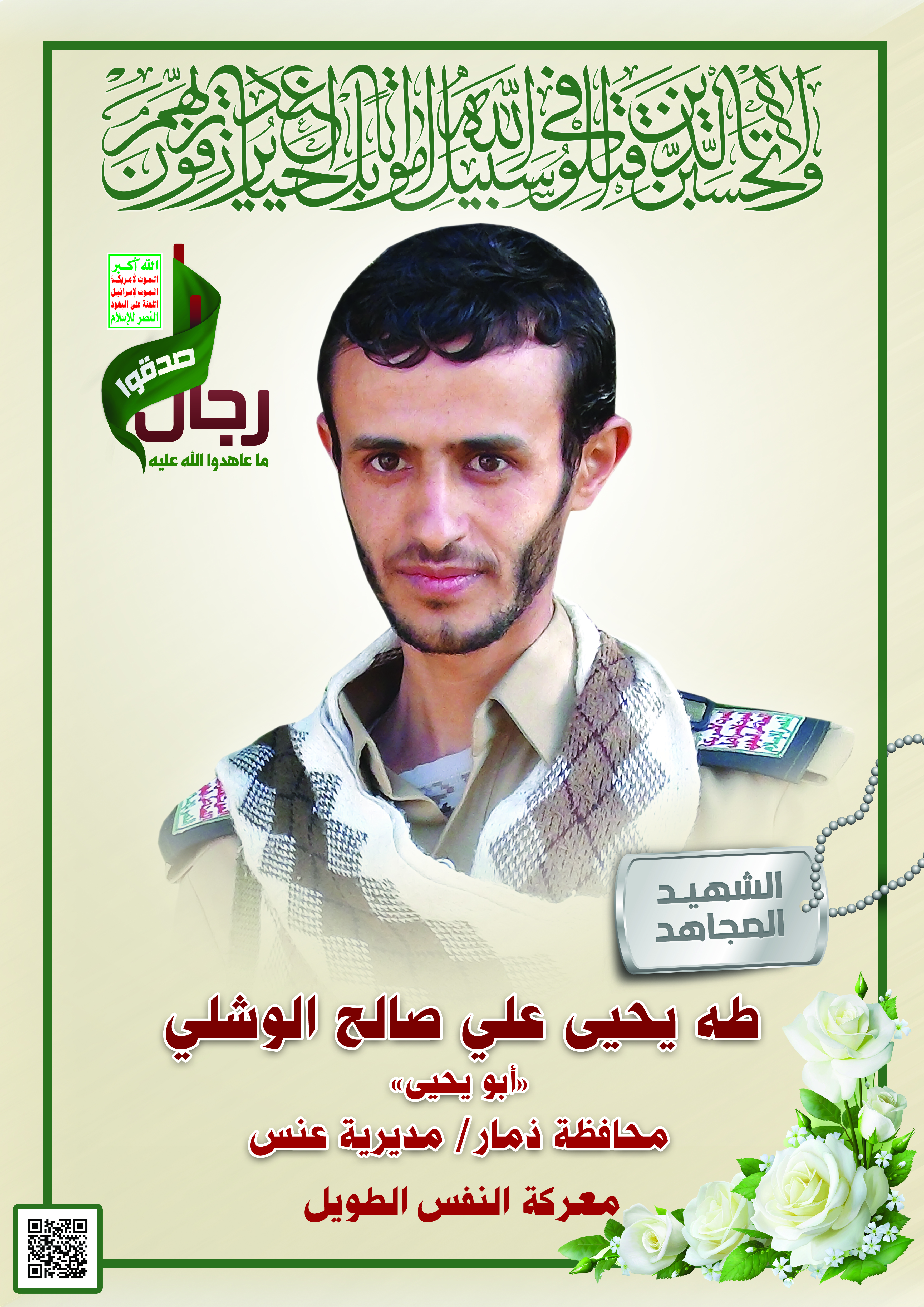 Actor طه يحيى علي صالح الوشلي Filmography SONY DSC SONY DSC SONY DSC الشهيد المجاهد: طه يحيى علي صالح الوشلي – أبو يحيى المحافظة: ذمار المديرية: عنس زبيد – معركة النفس الطويل رقم الحافظة: 123084 FILMOGRAPHY icon فلاشة وصايا الخالدين – طه يحيى علي صالح الوشلي – أبو يحيى 11/01/2020 25/11/2021