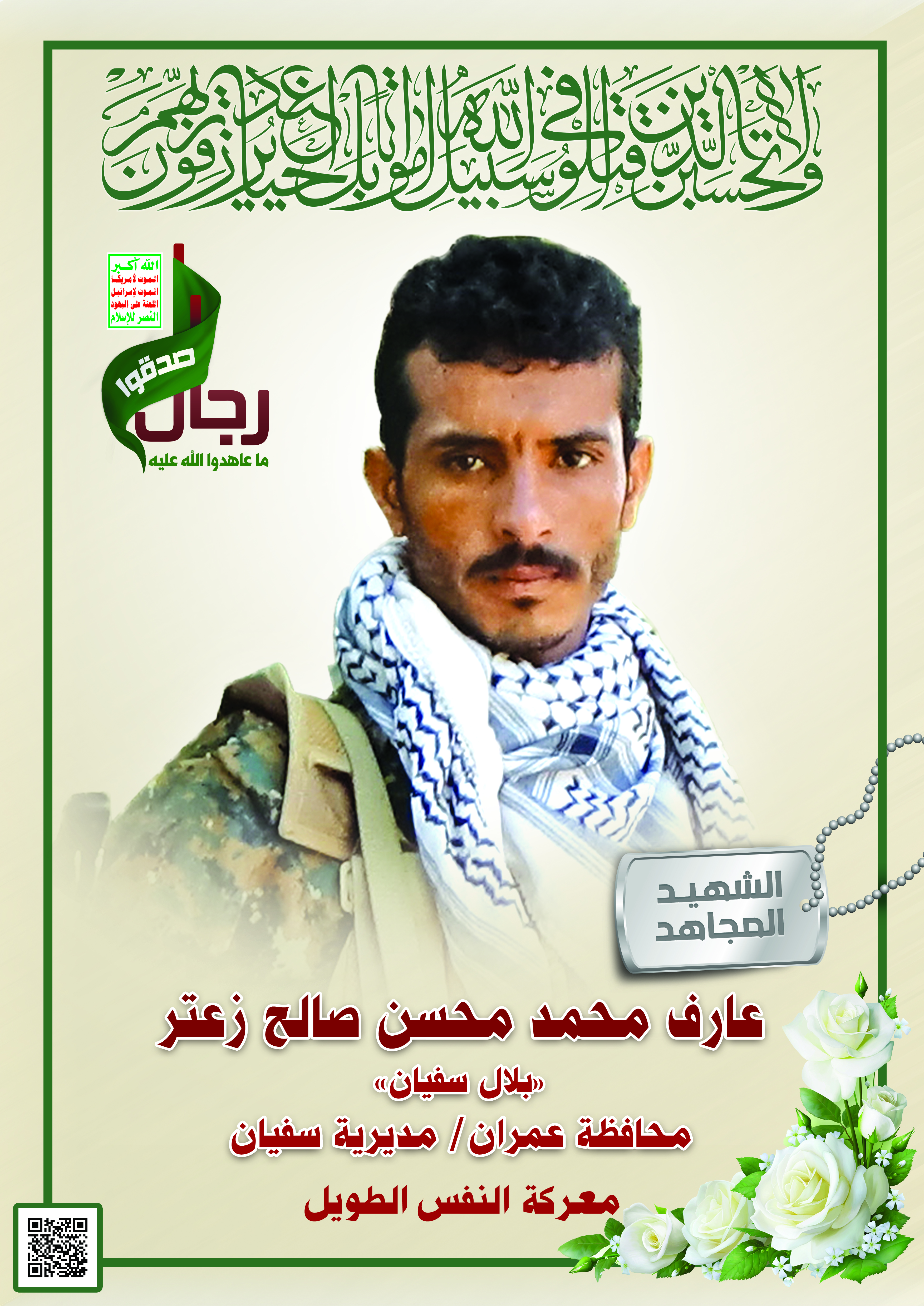 Actor عارف محمد محسن صالح حسن زعتر Filmography الشهيد المجاهد: عارف محمد محسن صالح حسن زعتر – أبو بلال المحافظة: عمران المديرية: سفيان – معركة النفس الطويل رقم الحافظة: 123087 FILMOGRAPHY icon عطاء الشهداء – القول السديد – 1442هـ 24/12/2020 15/12/2022 icon لكم الخلود – الشهيد المجاهد عارف محمد محسن زعتر (بلال سفيان) 14/09/2020 24/11/2021