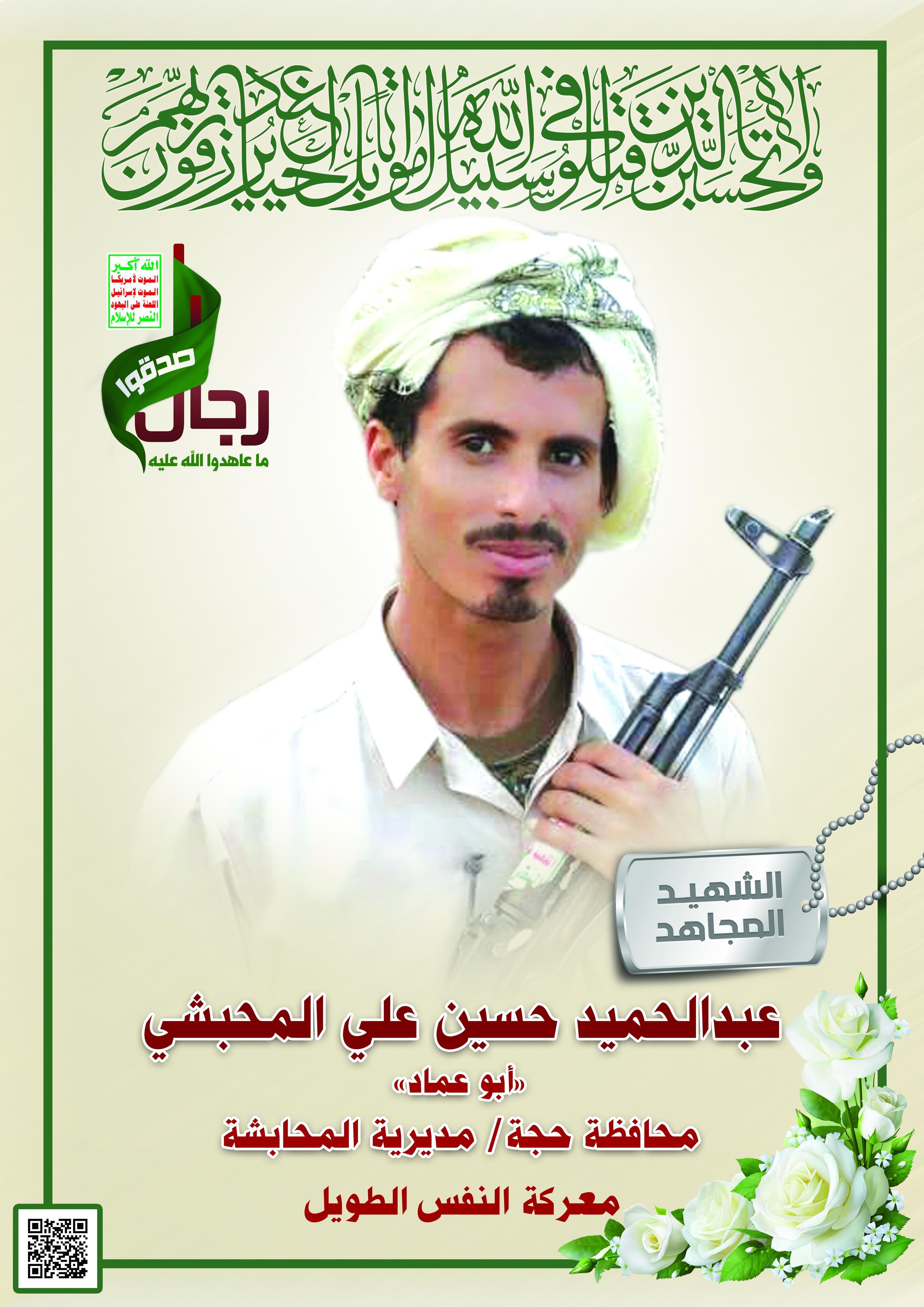 Actor عبدالحميد حسين علي حاج المحبشي Filmography الشهيد المجاهد: عبدالحميد حسين علي حاج المحبشي – أبو عماد المحافظة: حجة المديرية: المحابشة – جبل محبشي معركة النفس الطويل رقم الحافظة: 123092 FILMOGRAPHY icon عبد الحميد حسين المحبشي “أبو عماد” 12/01/2016 23/11/2021