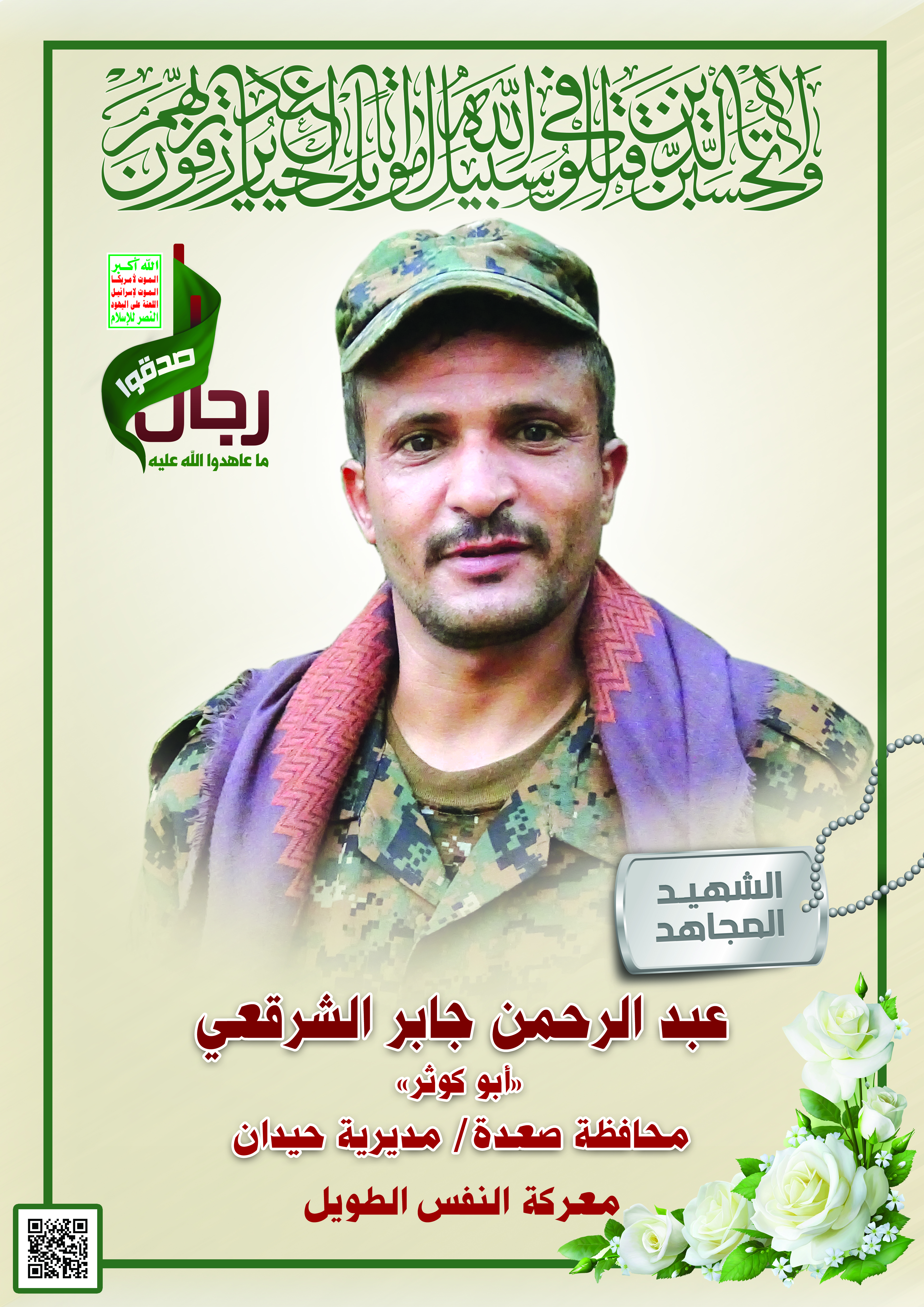 Actor عبدالرحمن جابر خرصان مفرح الشرقعي Filmography الشهيد المجاهد: عبدالرحمن جابر خرصان مفرح الشرقعي – أبو كوثر المحافظة: صعدة المديرية: حيدان – مران معركة النفس الطويل رقم الحافظة: 123095