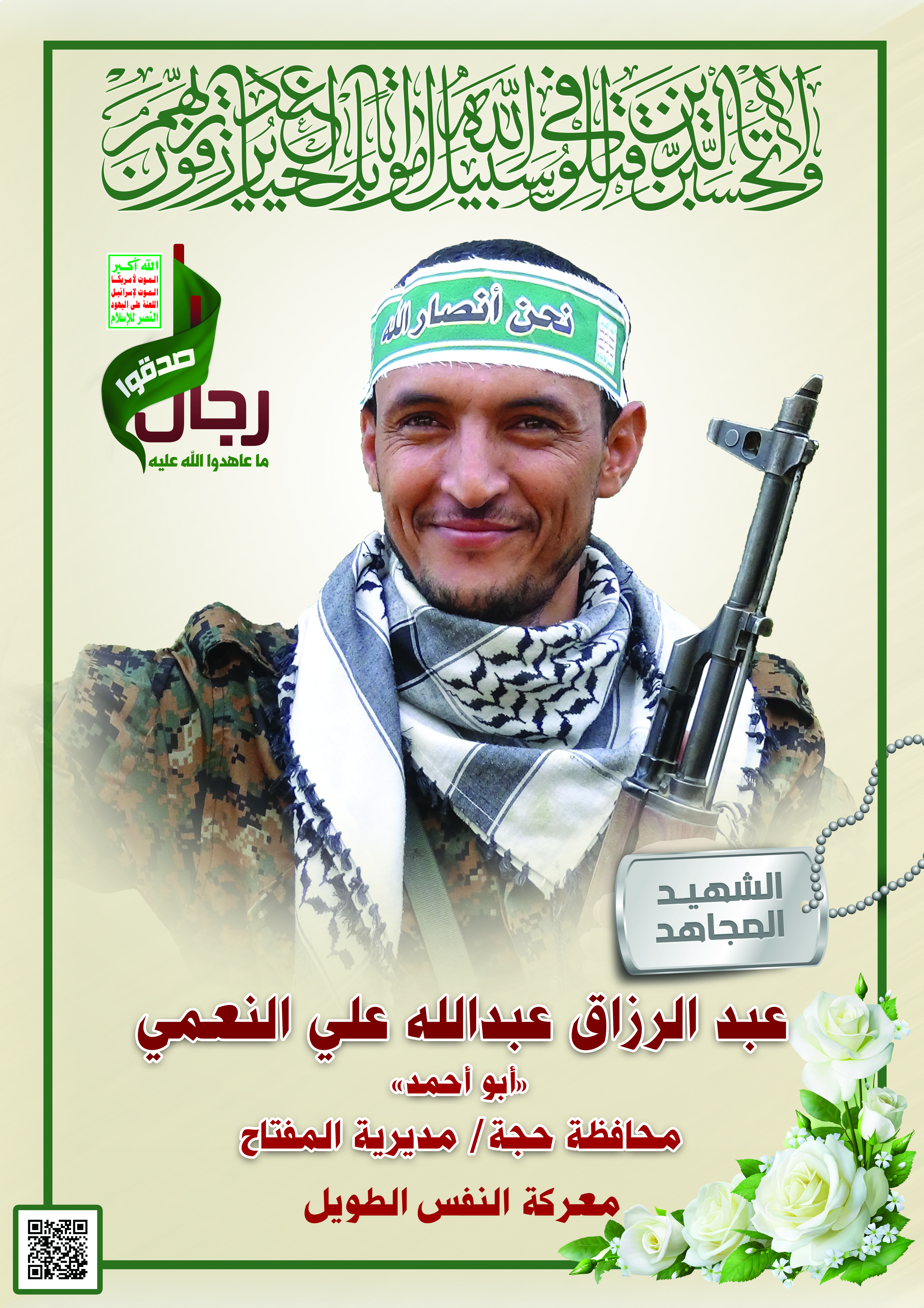 Actor عبدالرزاق عبدالله علي النعمي Filmography الشهيد المجاهد: عبدالرزاق عبدالله علي النعمي – أبو أحمد المحافظة: حجة المديرية: المفتاح – القزعة معركة النفس الطويل رقم الحافظة: 123098 FILMOGRAPHY icon مونتاج نشيد ربيون | فرقة أنصار الله – 1441هـ 15/01/2020 18/12/2021 icon مونتاج نشيد ألوية النصر | فرقة أنصار الله – 1441هـ 21/10/2019 20/12/2021 icon الشهيد المجاهد – عبدالرزاق عبدالله علي النعمي – ابو احمد 28/01/2019 23/11/2021 icon نشيد شموس الحق – فرقة أنصار الله 25/08/2018 17/11/2024
