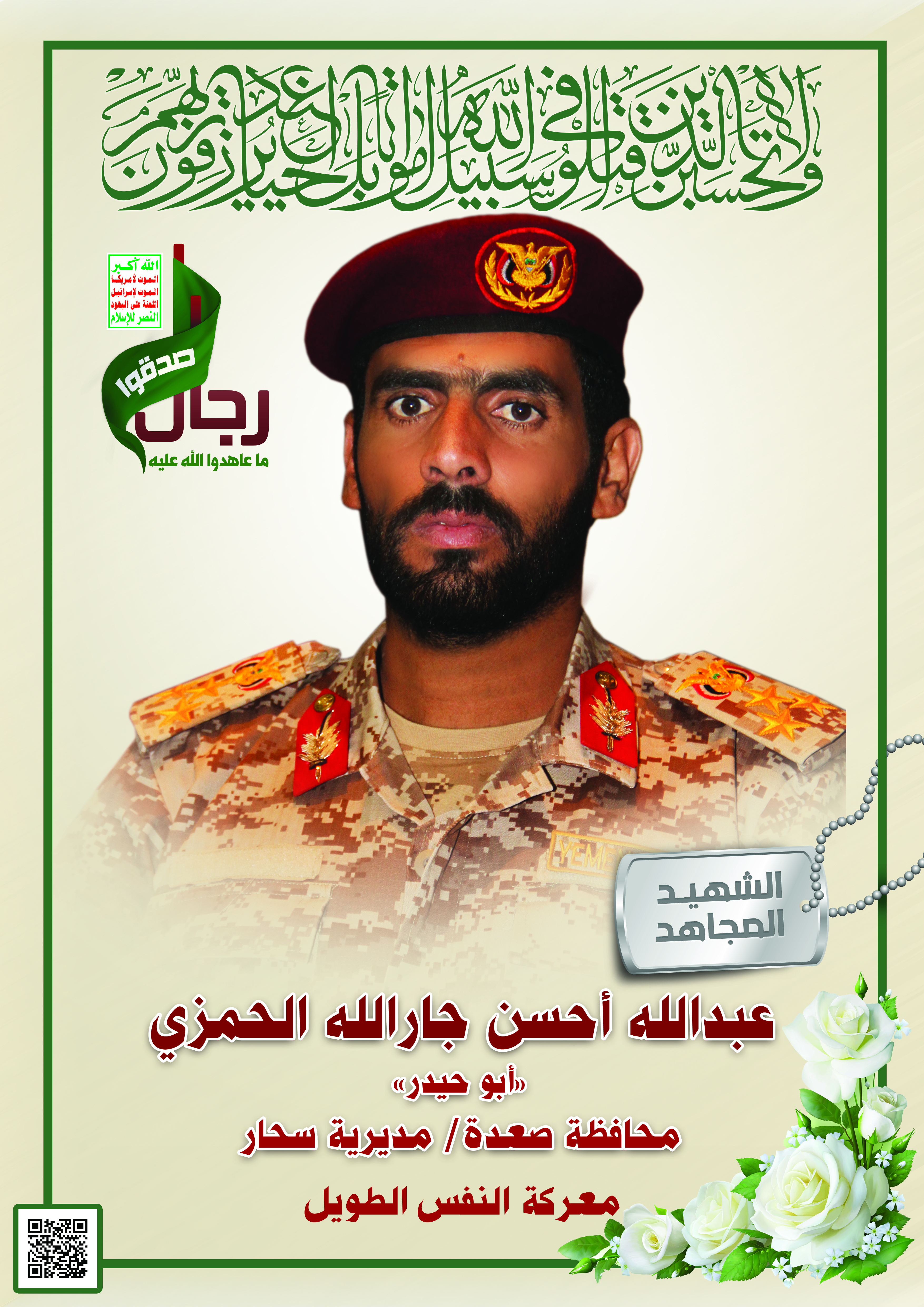 Actor عبدالله أحسن جار الله الحمزي Filmography الشهيد المجاهد: عبدالله أحسن جار الله الحمزي – أبو حيدر المحافظة: صعدة المديرية: سحار – الحمزات معركة النفس الطويل رقم الحافظة: 123116 FILMOGRAPHY icon بل أحياء – الشهيد عبد الله أحسن الحمزي (أبو حيدر) 27/12/2021 icon مدرسة الإيمان – القول السديد – 1442هـ 30/12/2020 23/12/2021 icon رسالة المجاهدين إلى رفاقهم الشهداء – 1441هـ 23/01/2020 04/01/2022 icon وثائقي | صولة ذي الفقار – الشهيد المجاهد أبو حيدر الحمزي – الإعلام الحربي 1440هـ 06/12/2018 04/12/2022 icon نشيد شموس الحق – فرقة أنصار الله 25/08/2018 17/11/2024 icon فلاشة لكم الخلود – الشهيد عبدالله أحسن جار الله الحمزي “أبو حيدر” 25/06/2017 13/12/2021