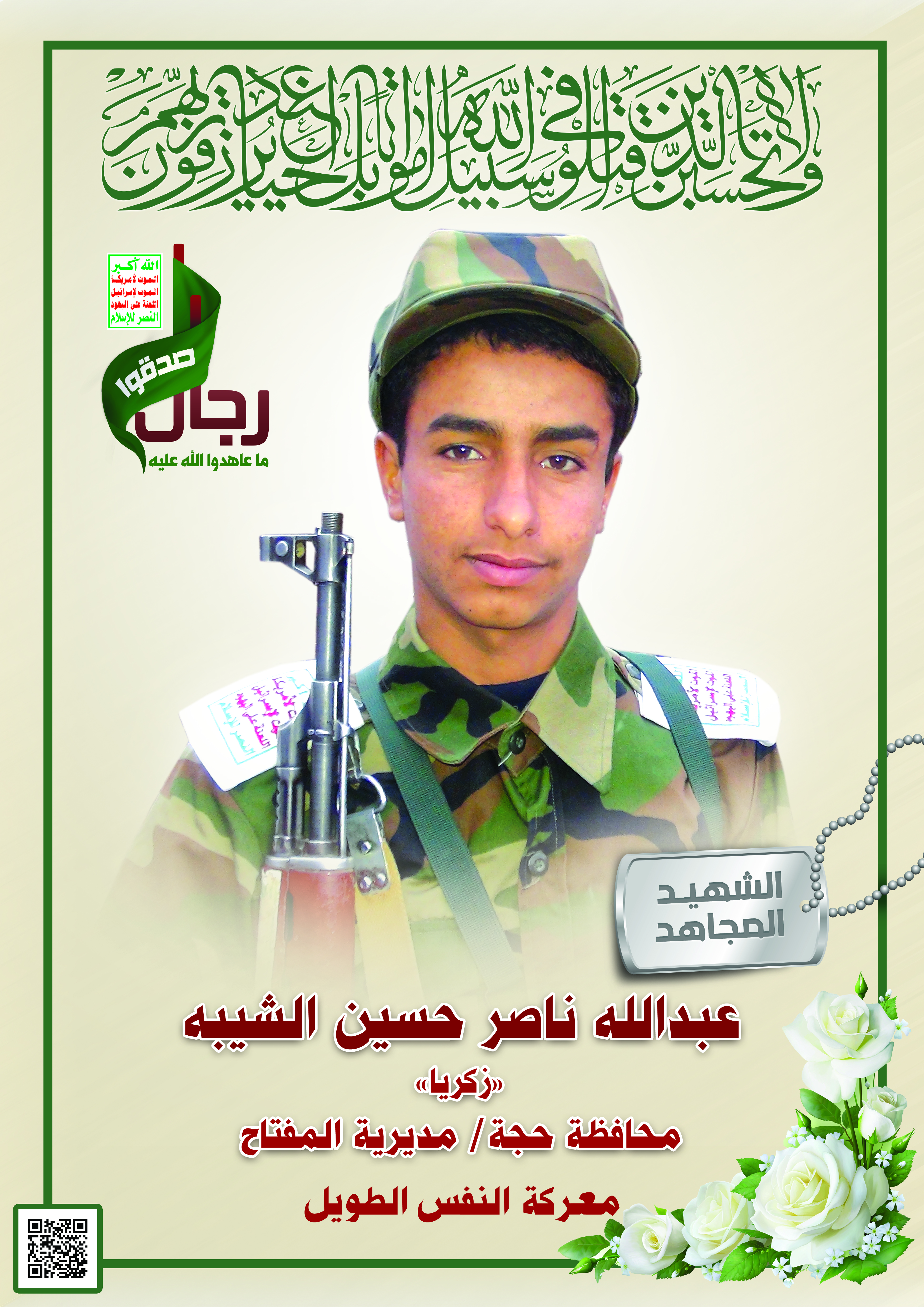 Actor عبدالله ناصر حسين الشيبة Filmography الشهيد المجاهد: عبدالله ناصر حسين الشيبة – زكريا المحافظة: حجة المديرية: المفتاح – بني زيد معركة النفس الطويل رقم الحافظة: 123126 FILMOGRAPHY icon عبدالله ناصر حسين الشيبة “زكريا” 08/02/2018 23/11/2021