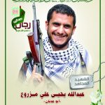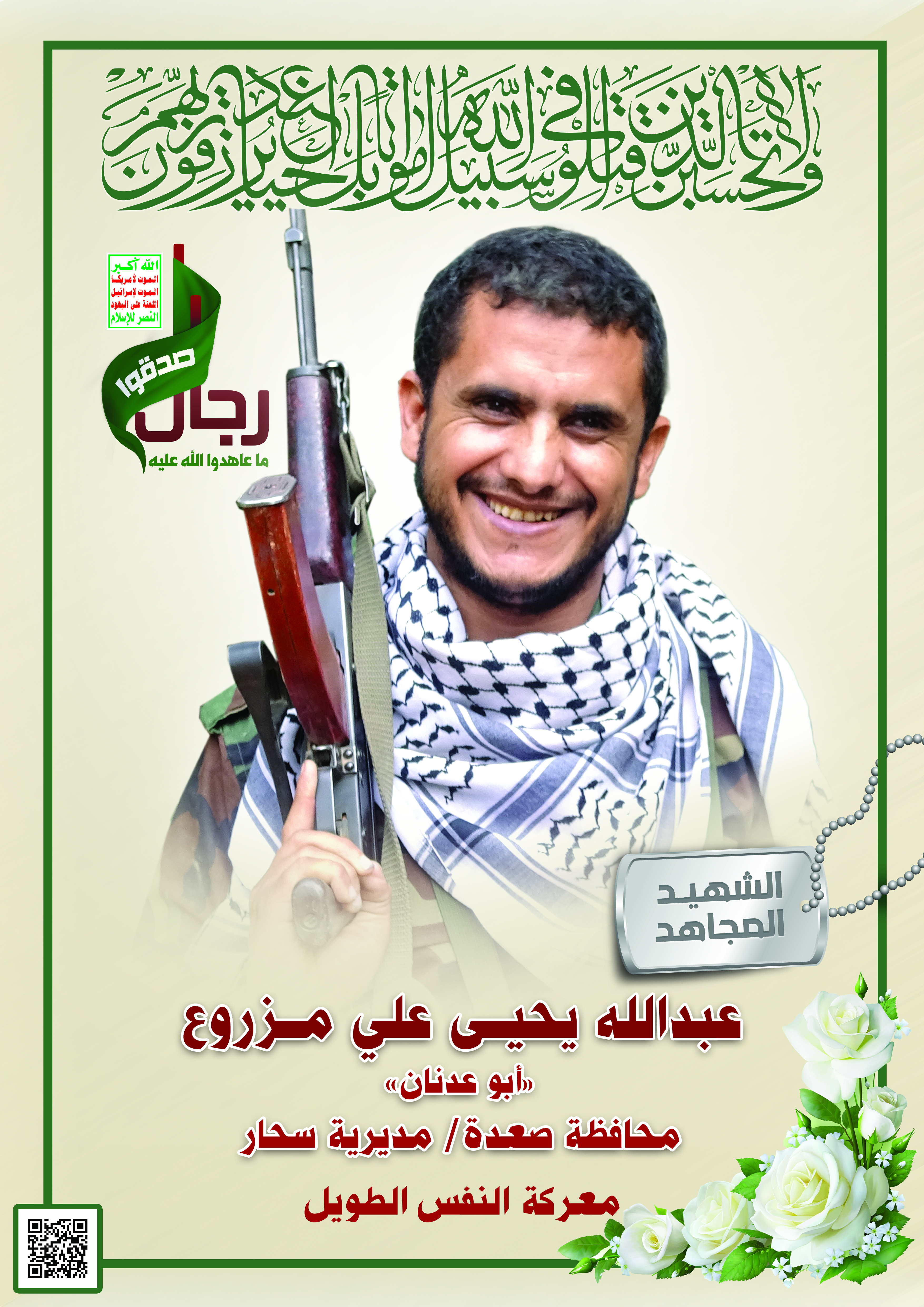 Actor عبدالله يحيى علي محمد ناشر مزروع Filmography الشهيد المجاهد: عبدالله يحيى علي محمد ناشر مزروع – أبو عدنان المحافظة: صعدة المديرية: سحار – الطلح معركة النفس الطويل رقم الحافظة: 123127 FILMOGRAPHY icon مونتاج نشيد نور الشهادة | فرقة أنصار الله 1443هـ 15/12/2021 18/12/2021 icon طريق الخلود – الشهيد المجاهد عبدالله مزروع “أبو عدنان” – الإعلام الحربي 1442هـ 07/07/2021 07/07/2022 icon طريق الخلود – الشهيد المجاهد عبدالله مزروع “أبو عدنان” – الإعلام الحربي 1442هـ 05/07/2021 07/07/2022 icon مونتاج نشيد شهداؤنا عظماؤنا | فرقة انصار الله – 1442 هـ 25/12/2020 18/12/2021 icon ثقافة الشهادة – من القول السديد – 1442هـ 19/12/2020 15/12/2022 icon لكم الخلود – الشهيد المجاهد عبدالله يحيى علي محمد ناشر مزروع (أبو عدنان) 20/11/2020 24/11/2021
