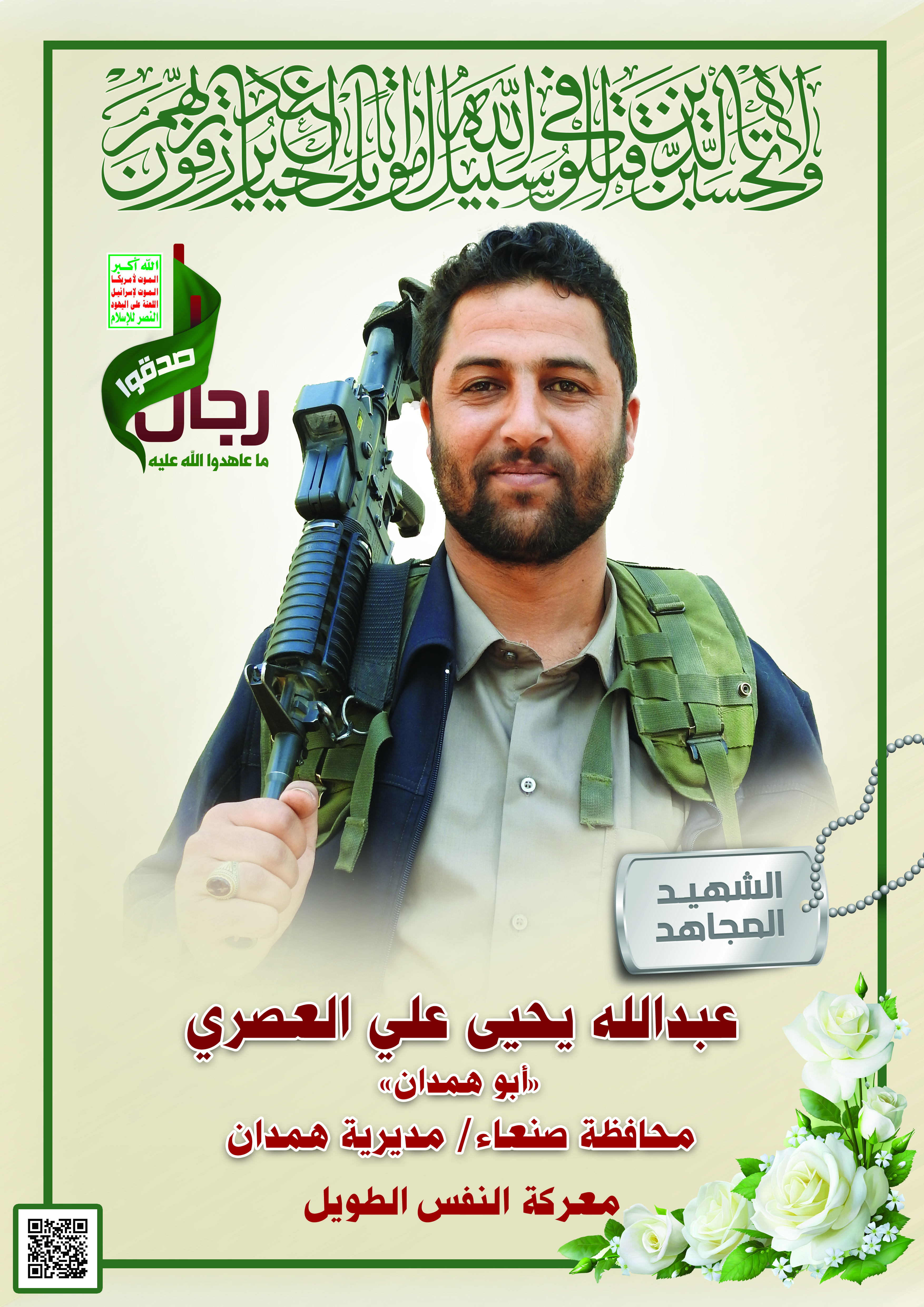 Actor عبدالله يحيى علي مقبل حسين العصري Filmography الشهيد المجاهد: عبدالله يحيى علي مقبل حسين العصري – أبو همدان المحافظة: صنعاء المديرية: همدان – ربع همدان معركة النفس الطويل رقم الحافظة: 123128 FILMOGRAPHY icon مونتاج نشيد شهداؤنا عظماؤنا | فرقة انصار الله – 1442 هـ 25/12/2020 18/12/2021 icon ثقافة الشهادة – من القول السديد – 1442هـ 19/12/2020 15/12/2022