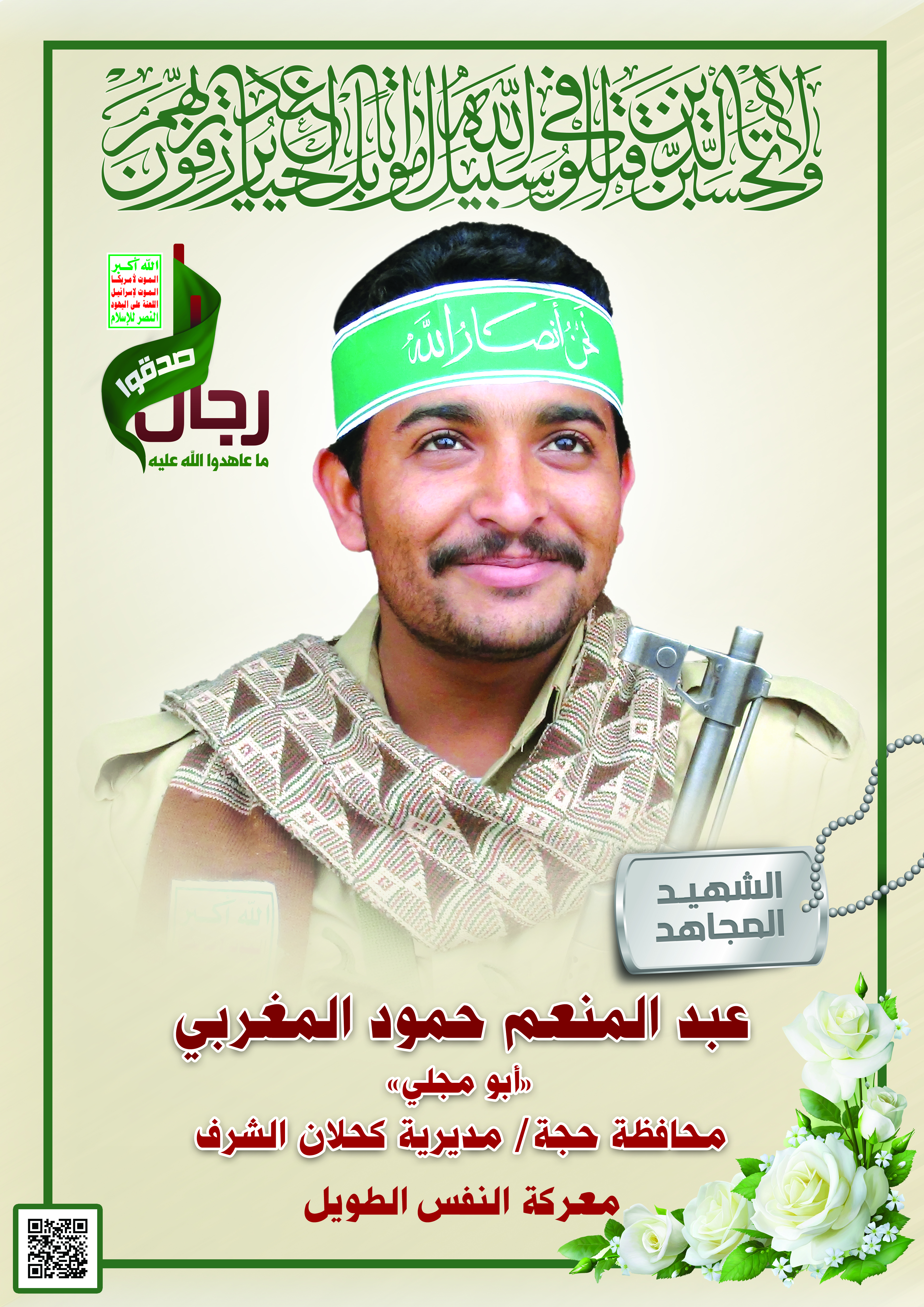 Actor عبدالمنعم حمود عبدالله يحيى أحمد المغربي Filmography الشهيد المجاهد: عبدالمنعم حمود عبدالله يحيى أحمد المغربي – أبو مجلي المحافظة: حجة المديرية: كحلان الشرف – معركة النفس الطويل رقم الحافظة: 123132 FILMOGRAPHY icon نشيد الشوق | فرقة الشهيد القائد – 1444هـ 11/12/2022 11/12/2022 icon مونتاج نشيد شهداؤنا عظماؤنا | فرقة انصار الله – 1442 هـ 25/12/2020 18/12/2021 icon كانوا هم الأوفياء – القول السديد – 1442هـ 23/12/2020 15/12/2022