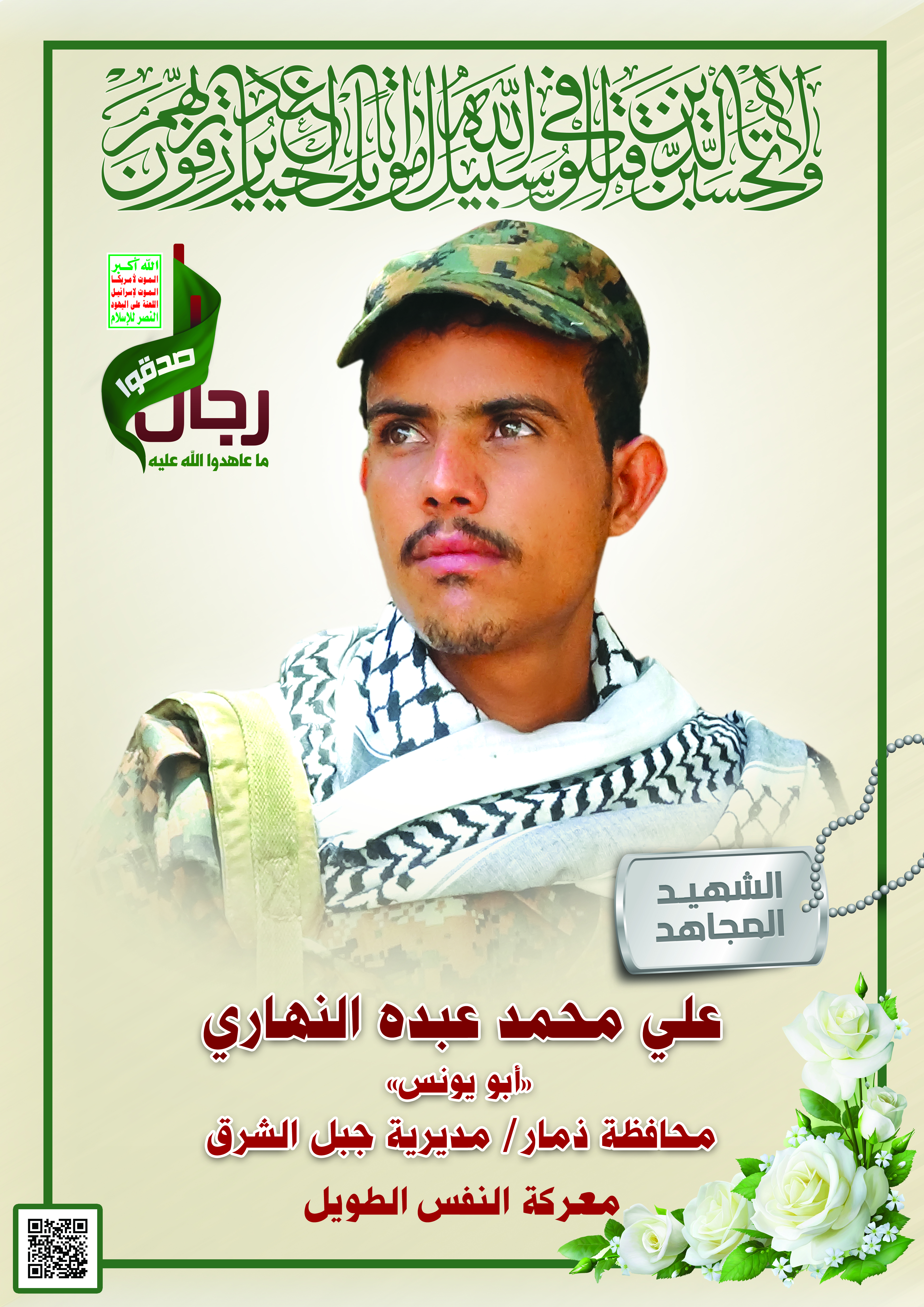 Actor علي محمد عبده محمد النهاري Filmography الشهيد المجاهد: علي محمد عبده محمد النهاري – أبو يونس المحافظة: ذمار المديرية: جبل الشرق – دمام معركة النفس الطويل رقم الحافظة: 123145 FILMOGRAPHY icon علي محمد عبده محمد النهاري “أبو يونس” 26/01/2017 22/11/2021