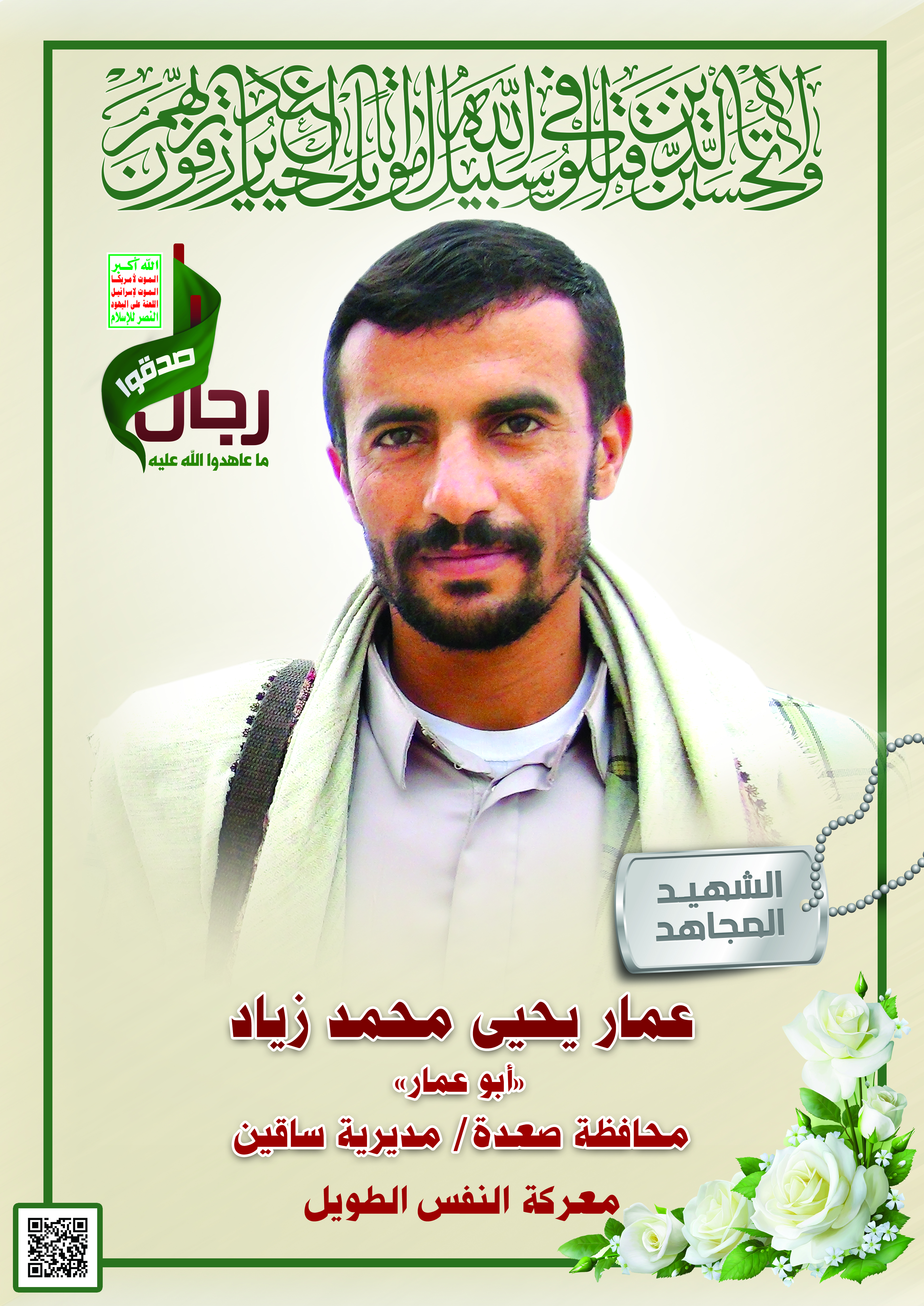 Actor عمار يحيى محمد زياد Filmography SONY DSC الشهيد المجاهد: عمار يحيى محمد زياد – أبو عمار المحافظة: صعدة المديرية: ساقين – الشعف معركة النفس الطويل رقم الحافظة: 123155