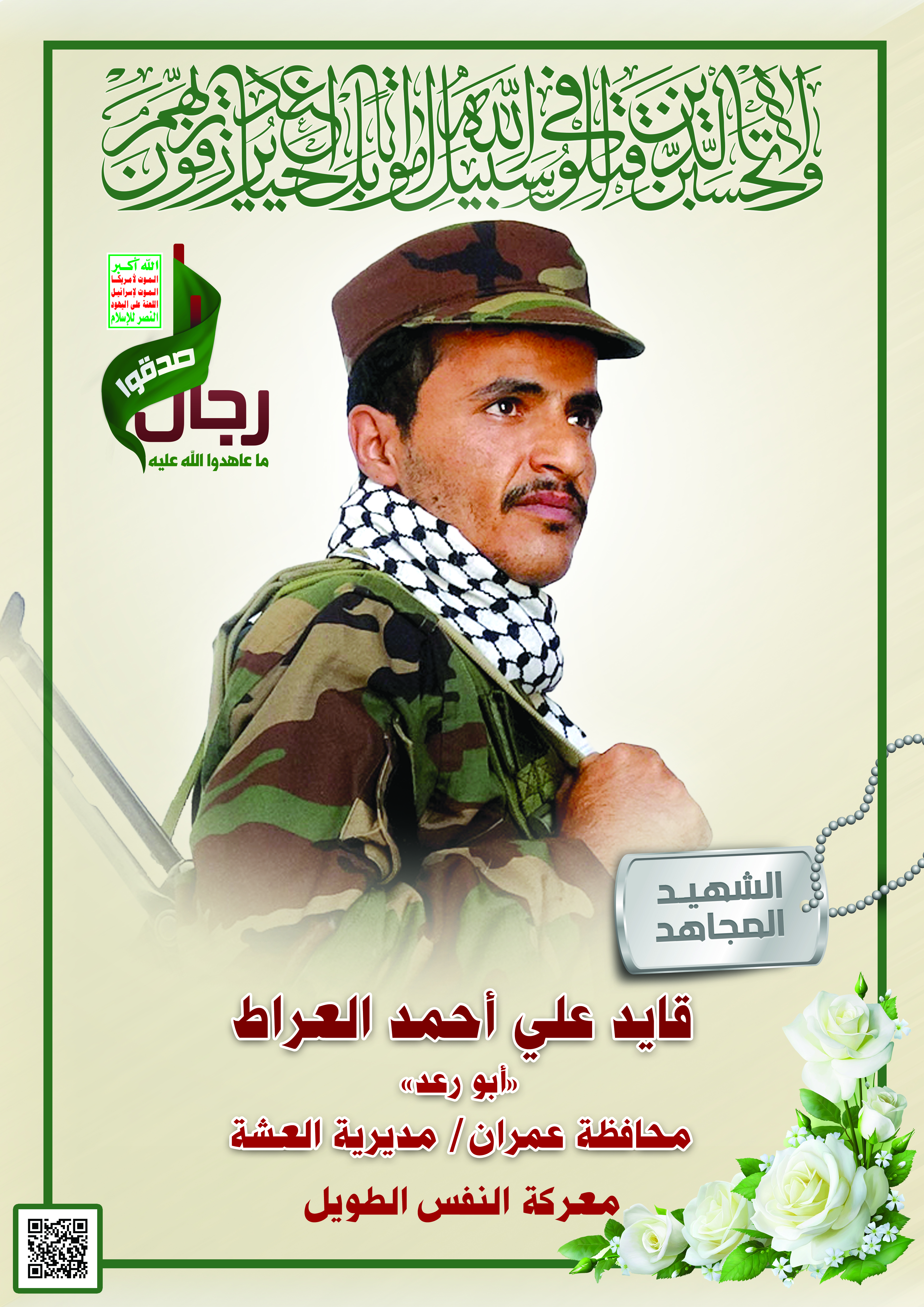 Actor قائد علي أحمد أحمد العراط Filmography الشهيد المجاهد: قائد علي أحمد أحمد العراط – أبو رعد المحافظة: عمران المديرية: العشة – ريشان معركة النفس الطويل رقم الحافظة: 123168 FILMOGRAPHY icon مونتاج نشيد شهداؤنا عظماؤنا | فرقة انصار الله – 1442 هـ 25/12/2020 18/12/2021 icon ثقافة الشهادة – من القول السديد – 1442هـ 19/12/2020 15/12/2022 icon لكم الخلود – الشهيد المجاهد قائد أحمد علي العراط (أبو رعد) 20/11/2020 13/12/2021