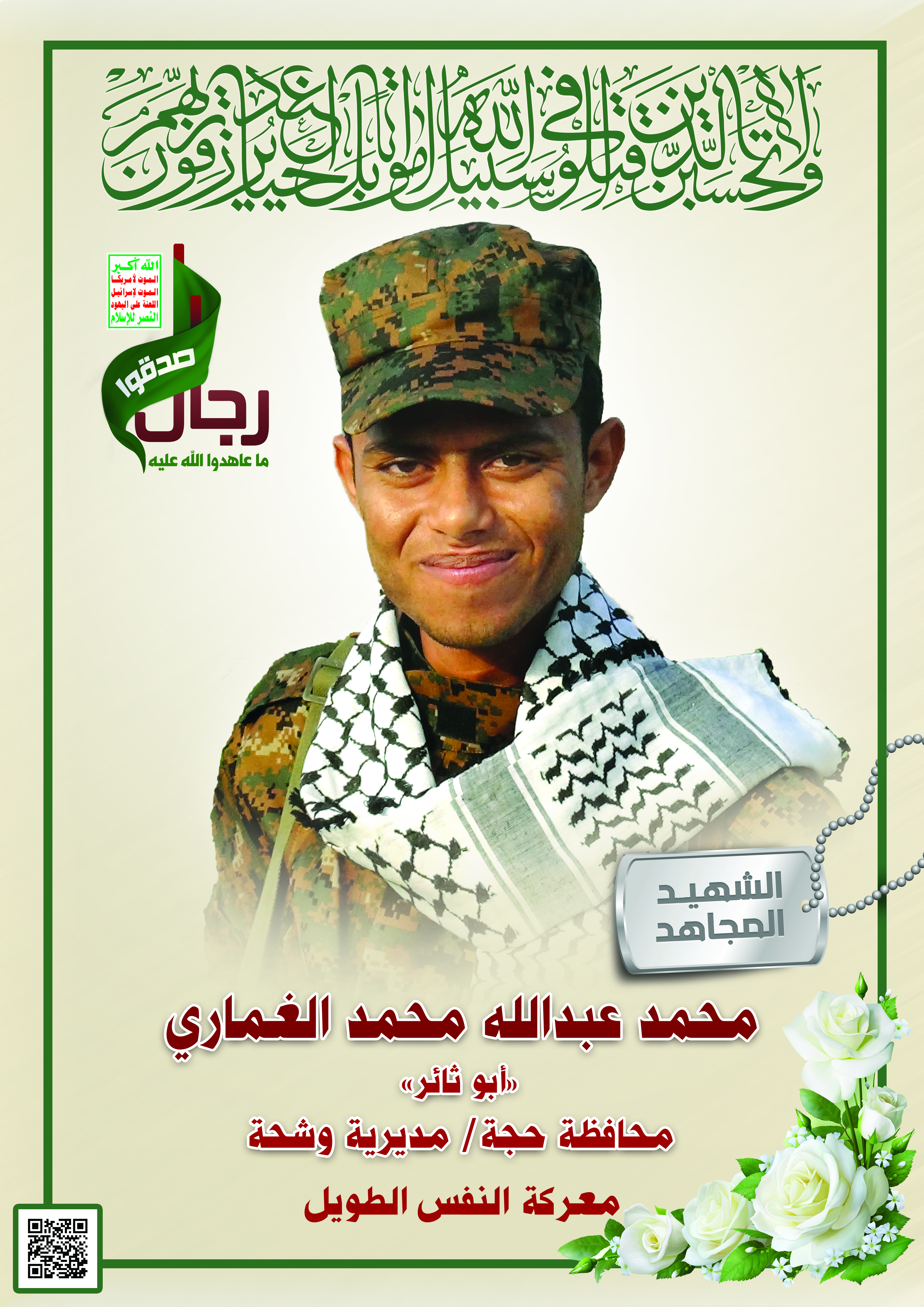 Actor محمد عبدالله محمد حسن الغماري Filmography الشهيد المجاهد: محمد عبدالله محمد حسن الغماري – أبو ثاير المحافظة: حجة المديرية: وشحة – معركة النفس الطويل رقم الحافظة: 123187 FILMOGRAPHY icon مونتاج نشيد ربيون | فرقة أنصار الله – 1441هـ 15/01/2020 18/12/2021 icon محمد عبدالله محمد حسن الغماري “أبو ثائر” 03/11/2016 23/11/2021