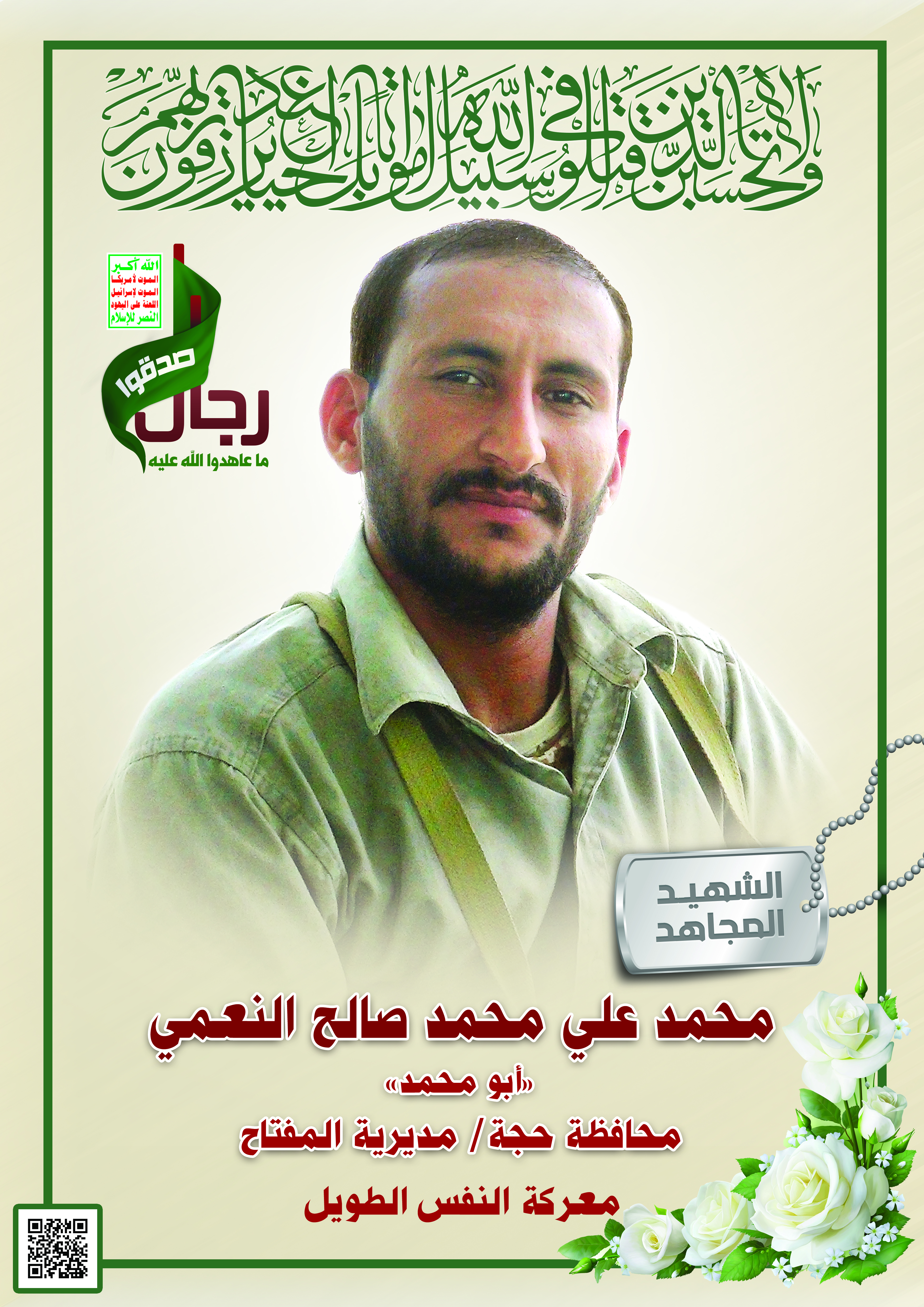 Actor محمد علي محمد صالح النعمي Filmography الشهيد المجاهد: محمد علي محمد صالح النعمي – أبو محمد المحافظة: حجة المديرية: المفتاح – القزعة معركة النفس الطويل رقم الحافظة: 123191 FILMOGRAPHY icon الشهيد المجاهد – محمد علي محمد صالح النعمي – أبو محمد 24/01/2019 24/11/2021