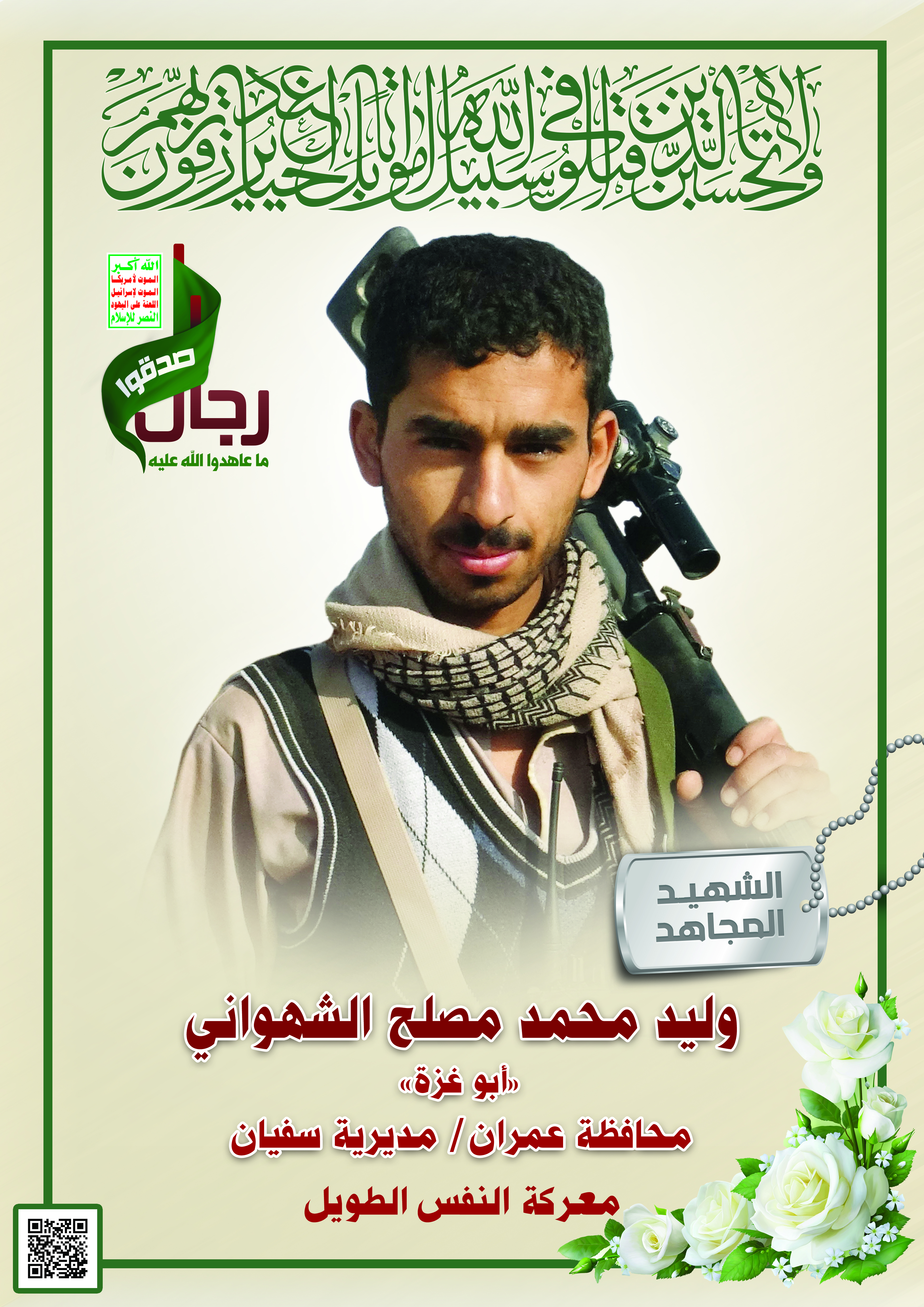 Actor وليد محمد مصلح الشهواني Filmography الشهيد المجاهد: وليد محمد مصلح الشهواني – أبو غزة المحافظة: عمران المديرية: سفيان – ذو شهوان معركة النفس الطويل رقم الحافظة: 123226